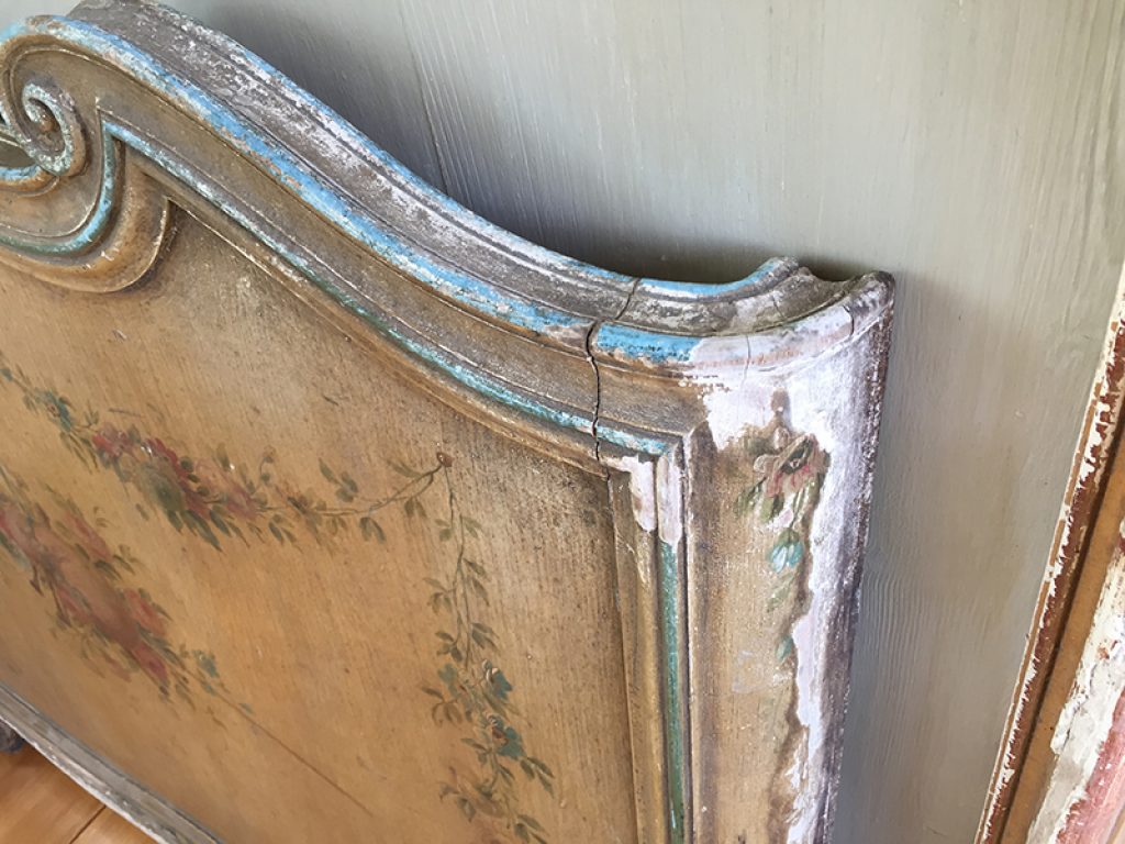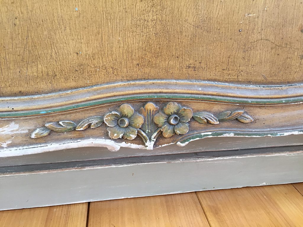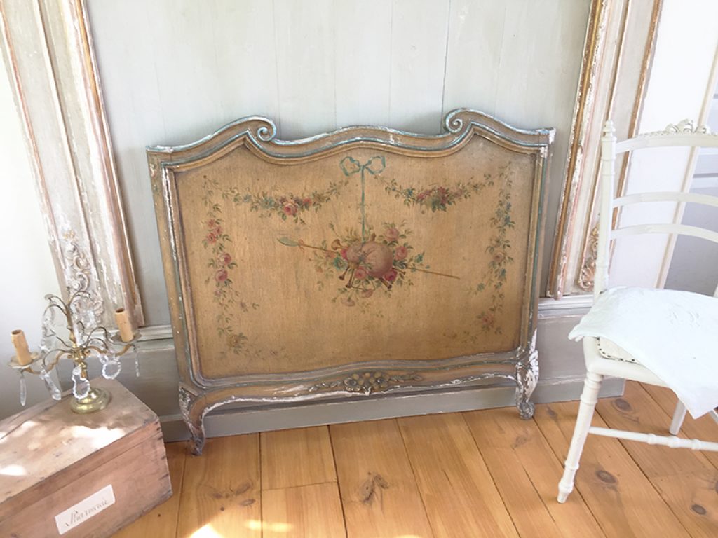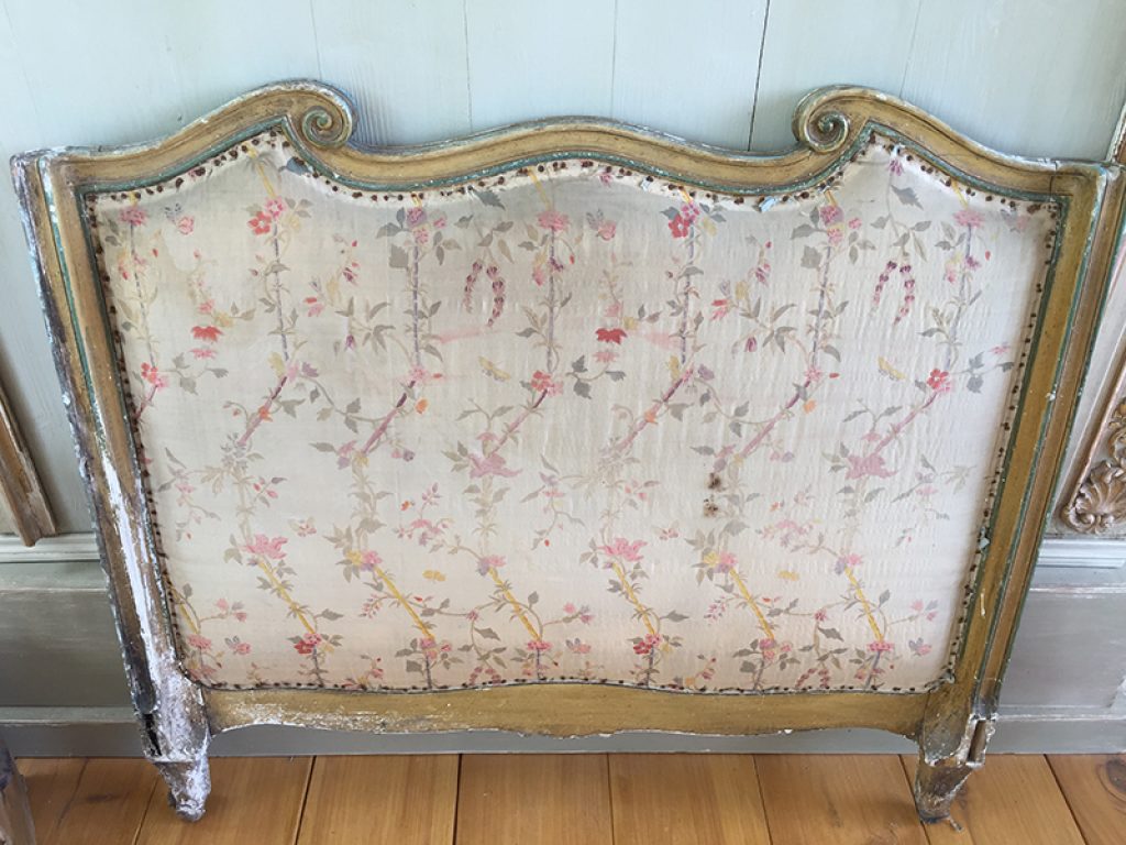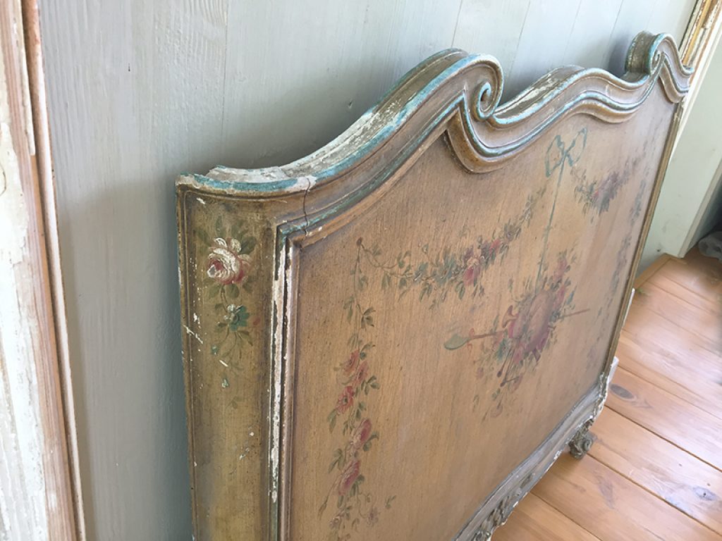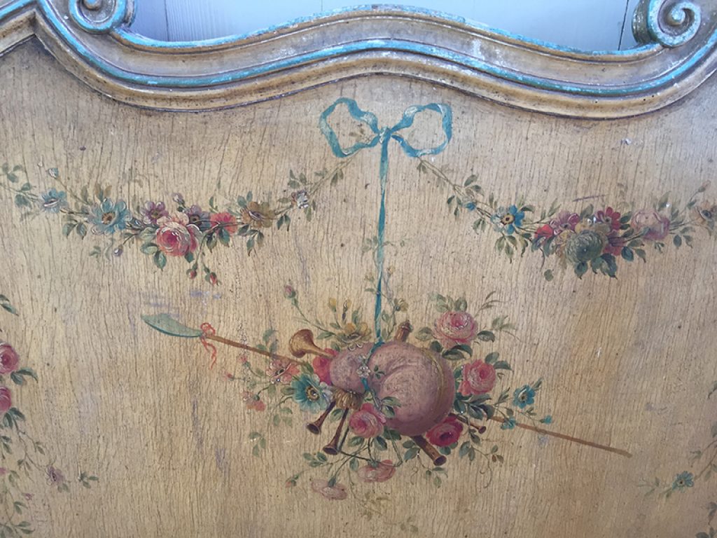 Ancien pied de lit, à imaginer en déco de charme comme une boiserie. Peint à la main d’un joli décor Louis XVI, guirlandes de fleurs et ruban bleu, dos recouvert de tissu. Dans son jus, petit manque sur un pied, anciennes traces de piqûres. A restaurer ou à laisser shabby selon les envies !