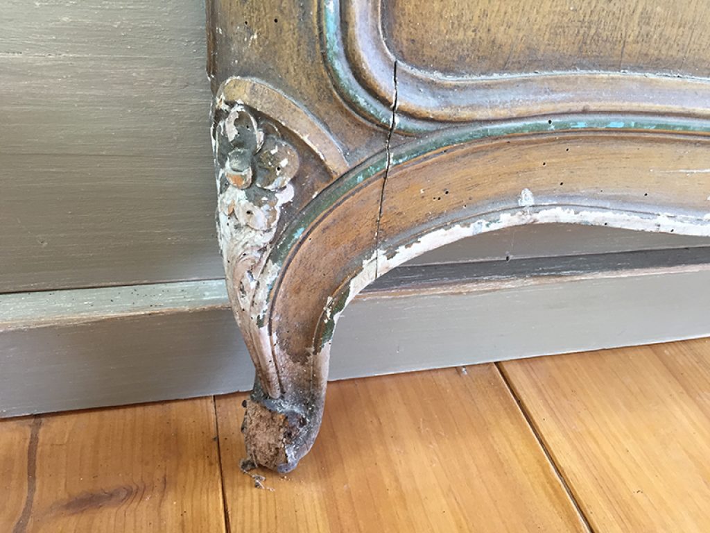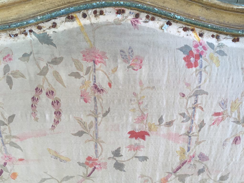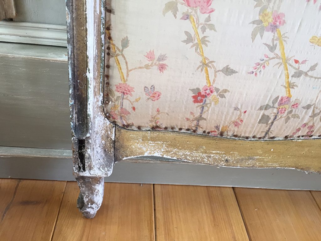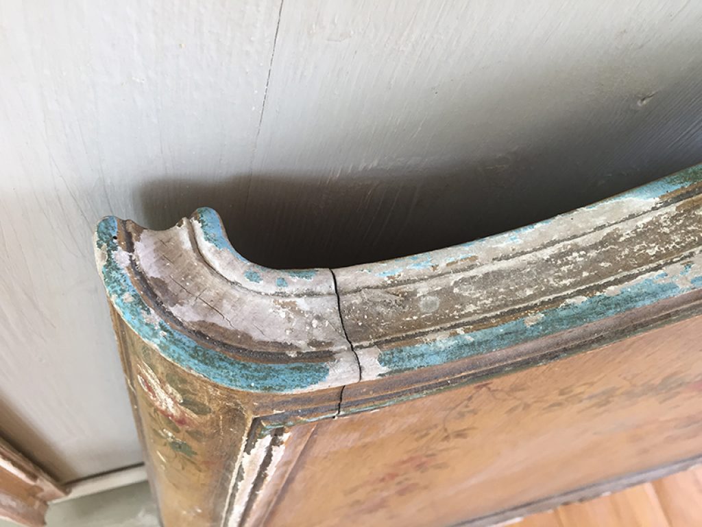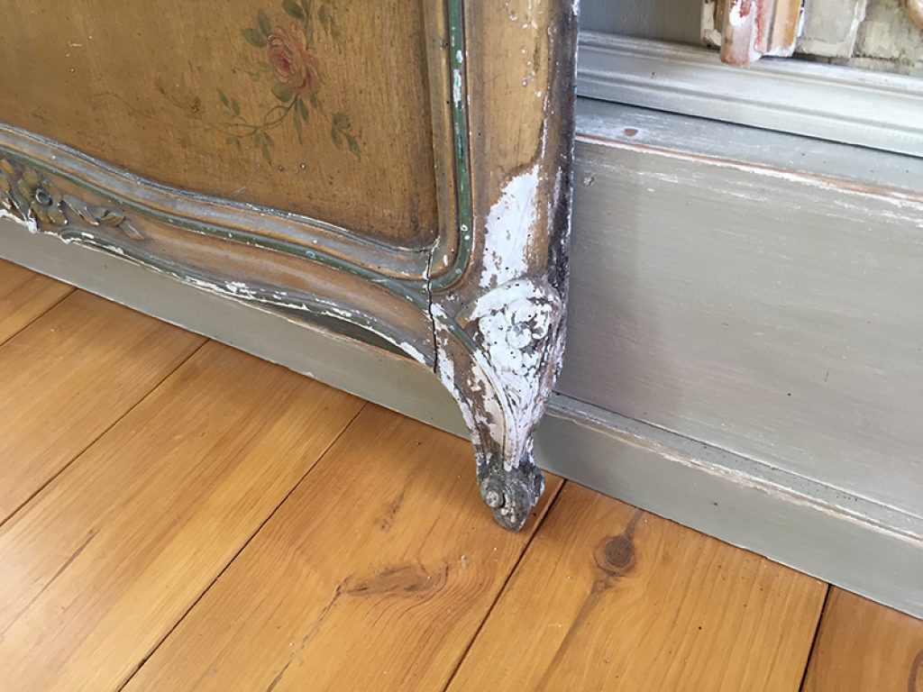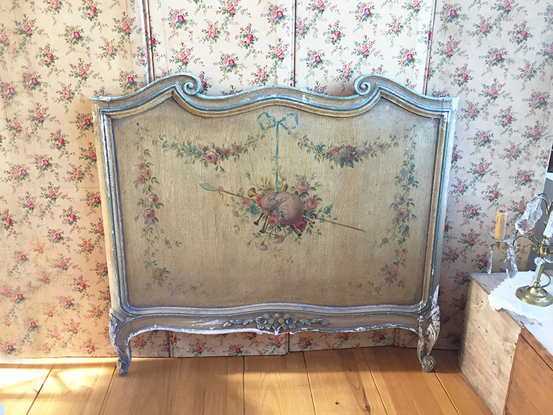 Ancien pied de lit, à imaginer en déco de charme comme une boiserie. Peint à la main d’un joli décor Louis XVI, guirlandes de fleurs et ruban bleu, dos recouvert de tissu. Dans son jus, petit manque sur un pied, anciennes traces de piqûres. A restaurer ou à laisser shabby selon les envies !