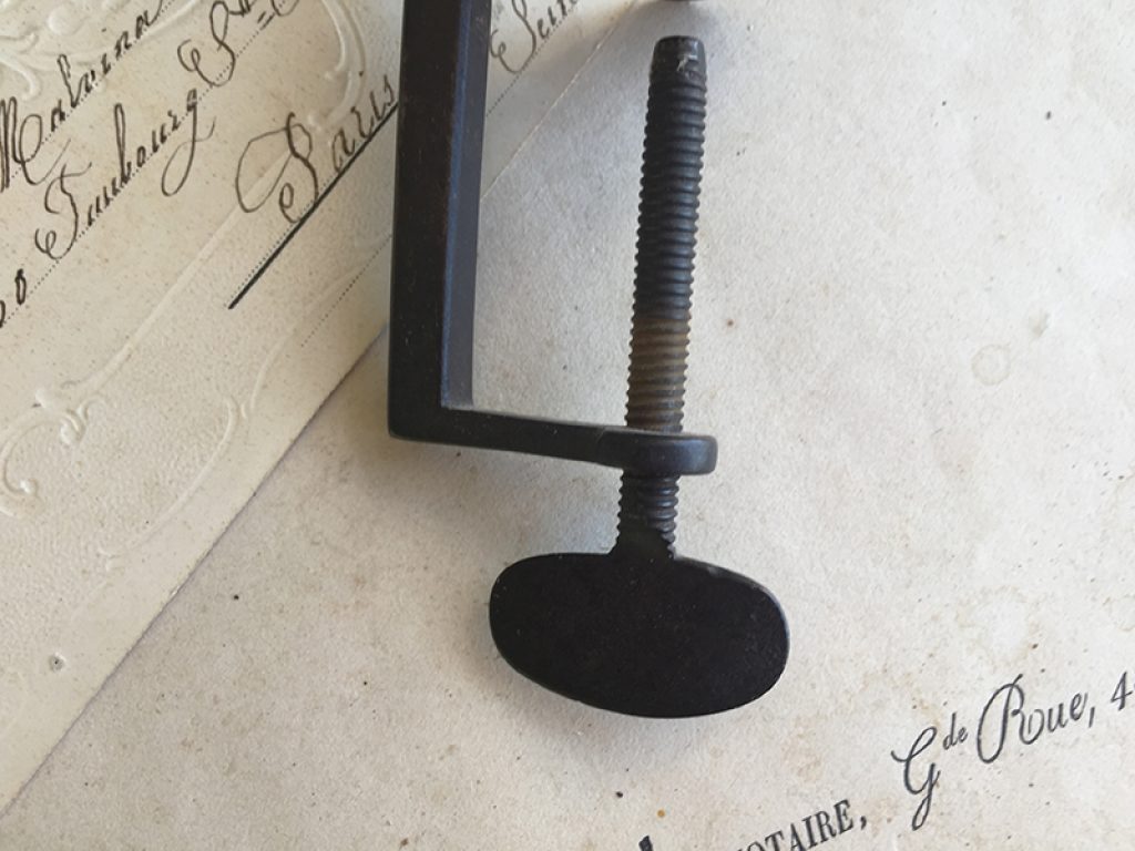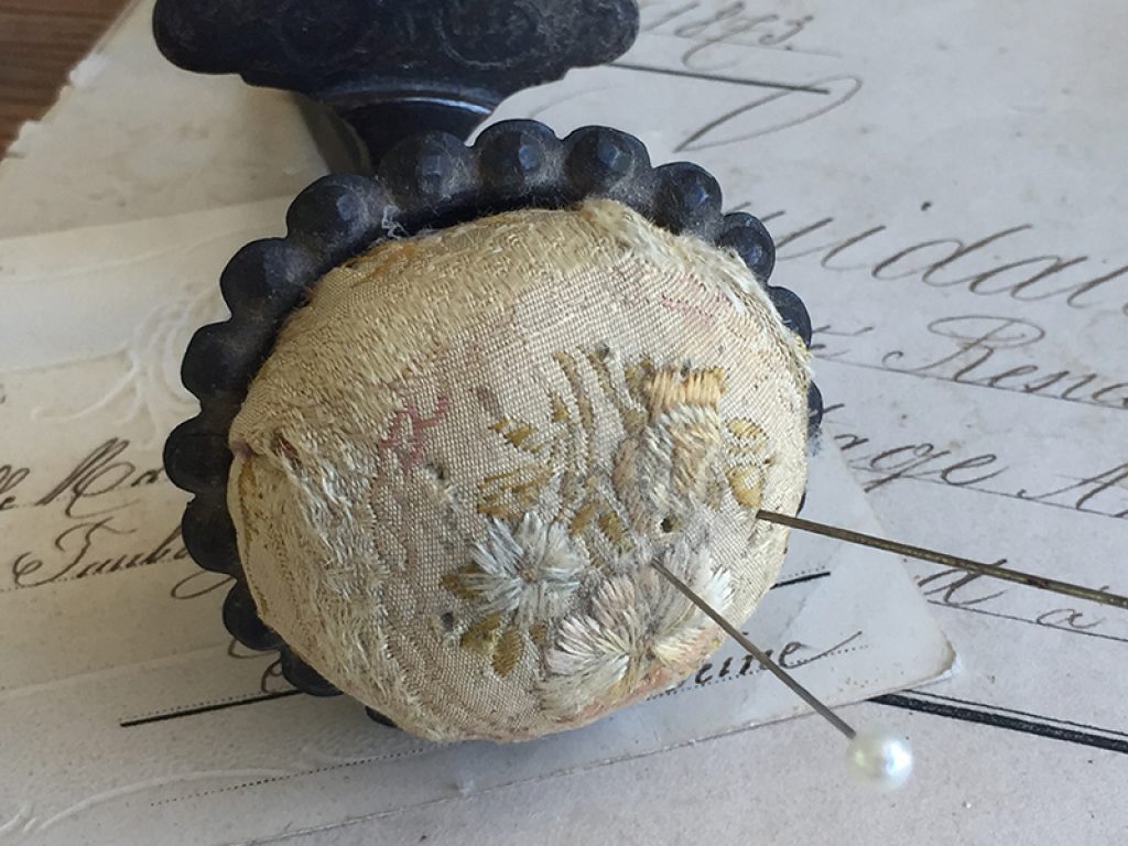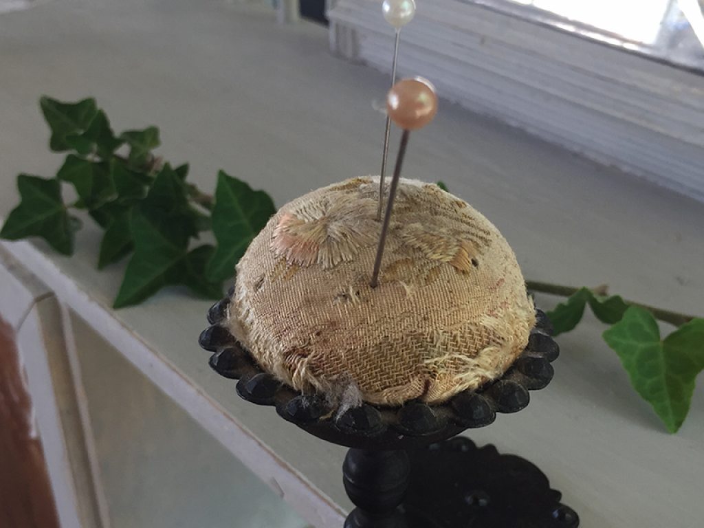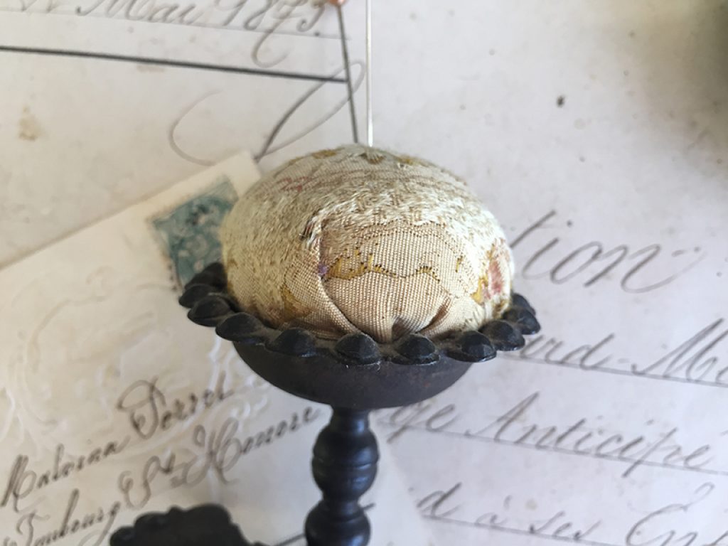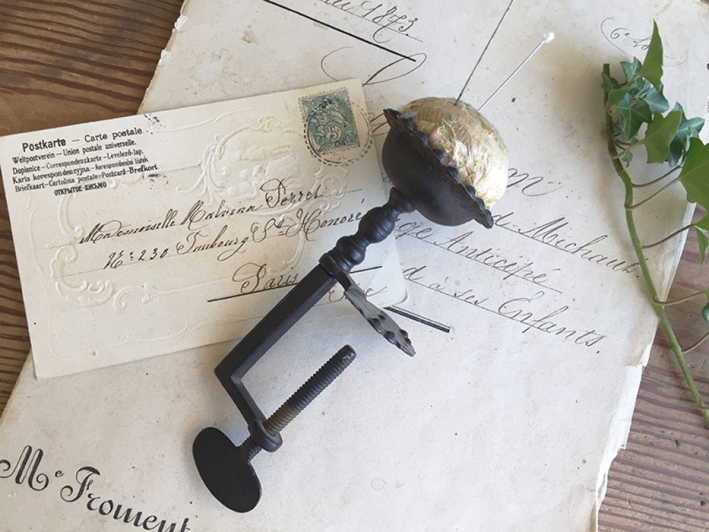 Ancien pique aiguille en métal et tissu (d’origine) à serrer sur un rebord de meuble ou d’étagère.