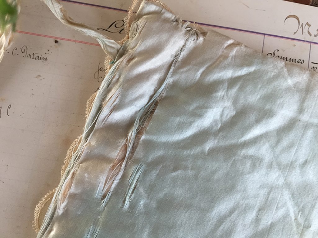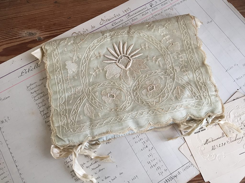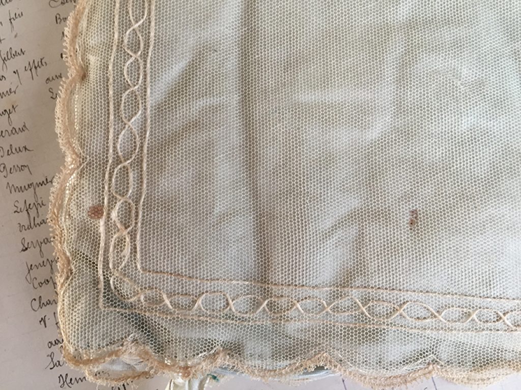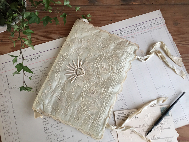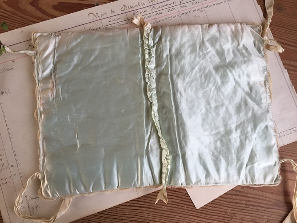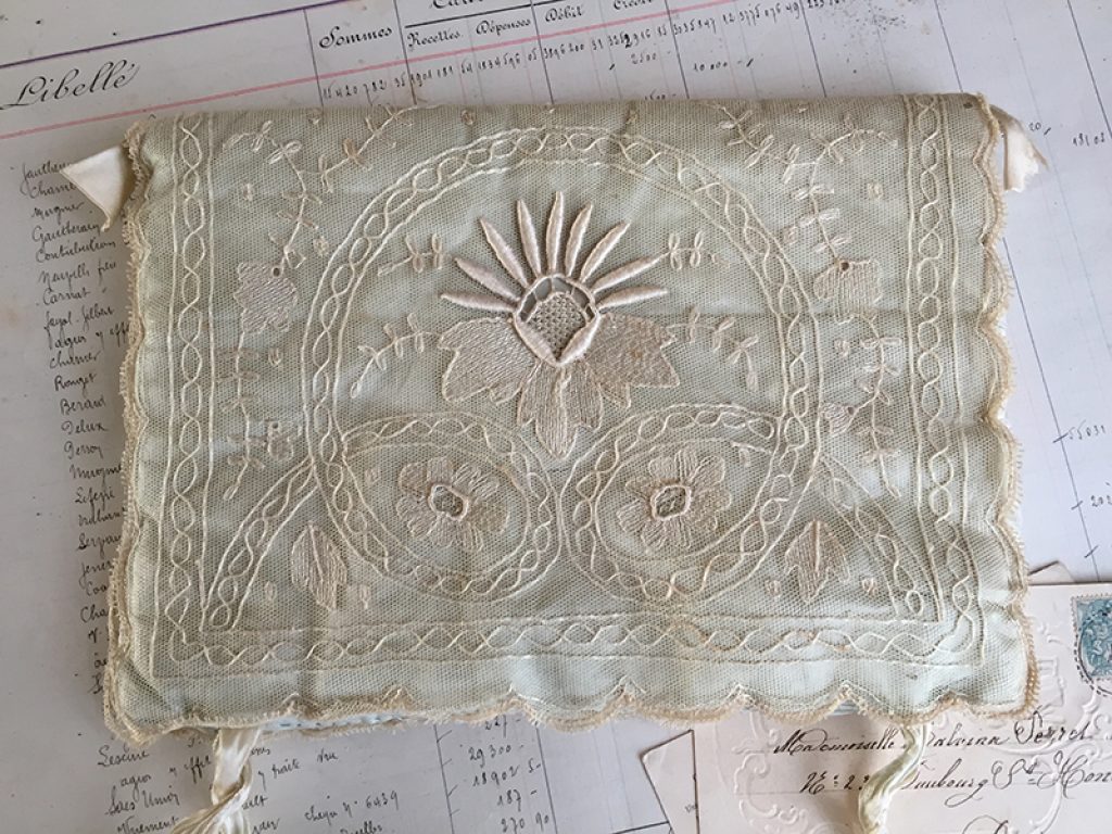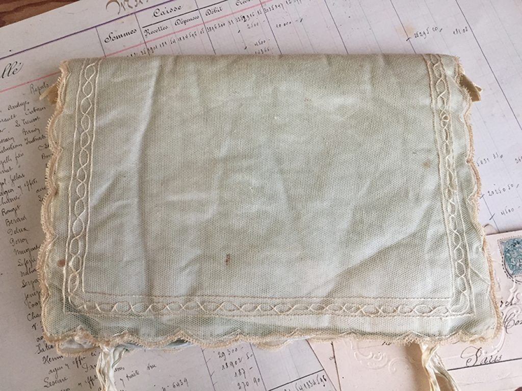 Jolie pochette ancienne pour mouchoirs ou lingerie, en soie recouverte de dentelle. Fermeture par rubans. Intérieur usé, petites taches de rouille.