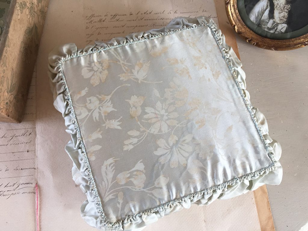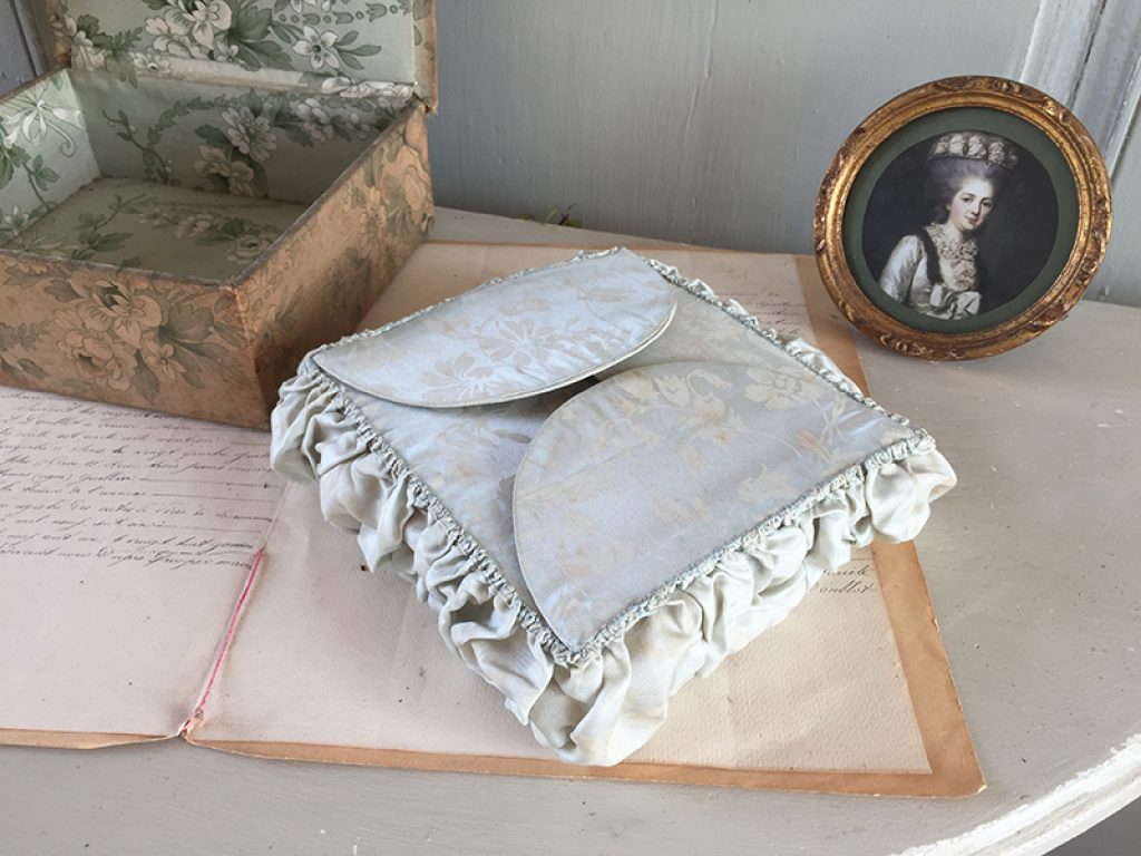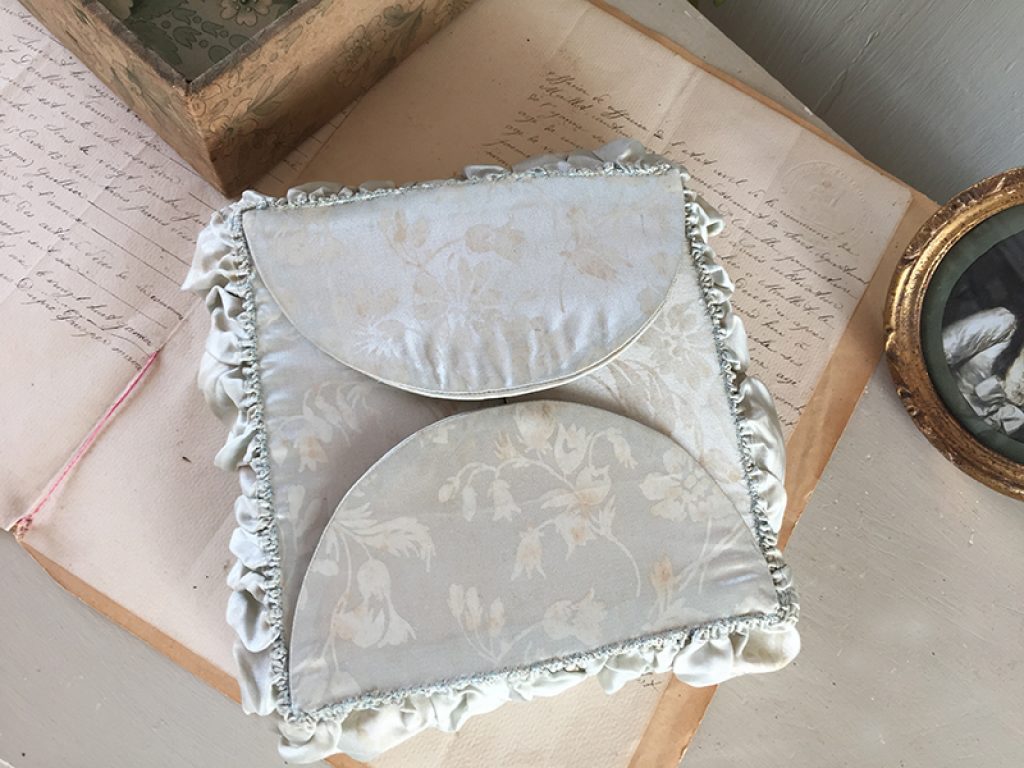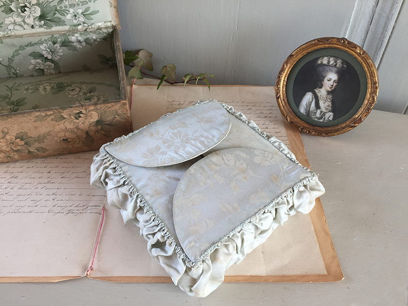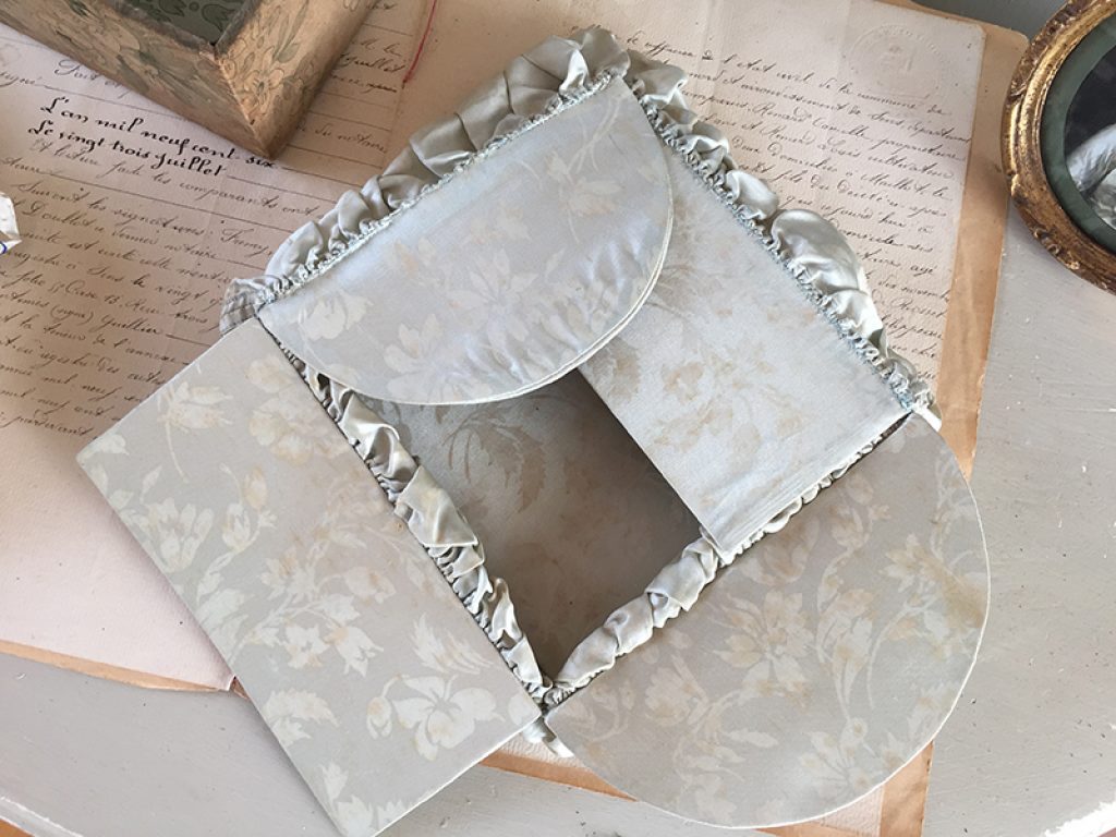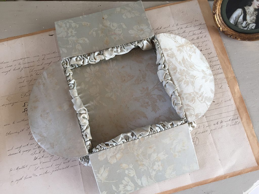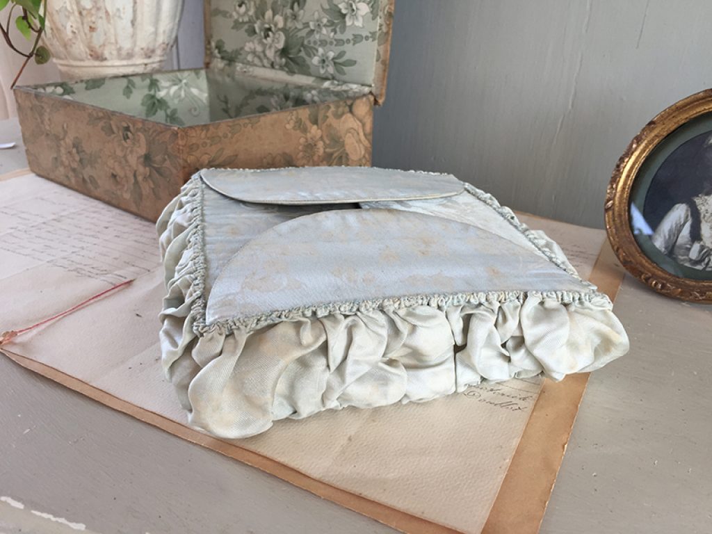 Ravissante petite boite ancienne à soufflets en tissu et carton, réalisée à la main. Se met à plat si elle est vide, joli tissu satiné bleu gris. A garnir de petits trésors !