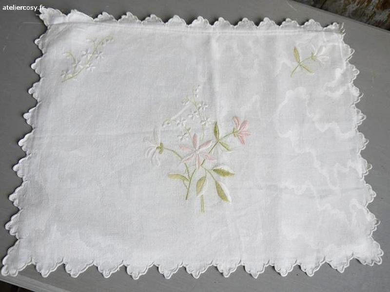 légante pochette ancienne brodée de fleurs, festonnée sur la couverture. Pour lingerie ou autre selon les envies ! une discrète trace sur l’intérieur, non lavée. 42 x 34 cm