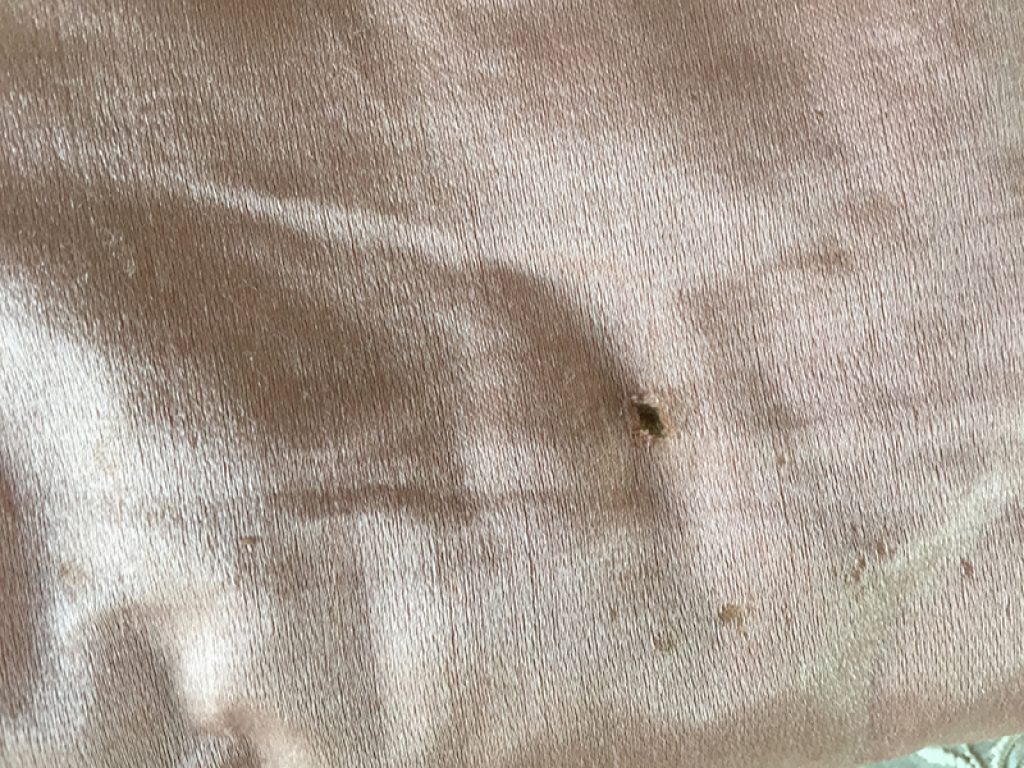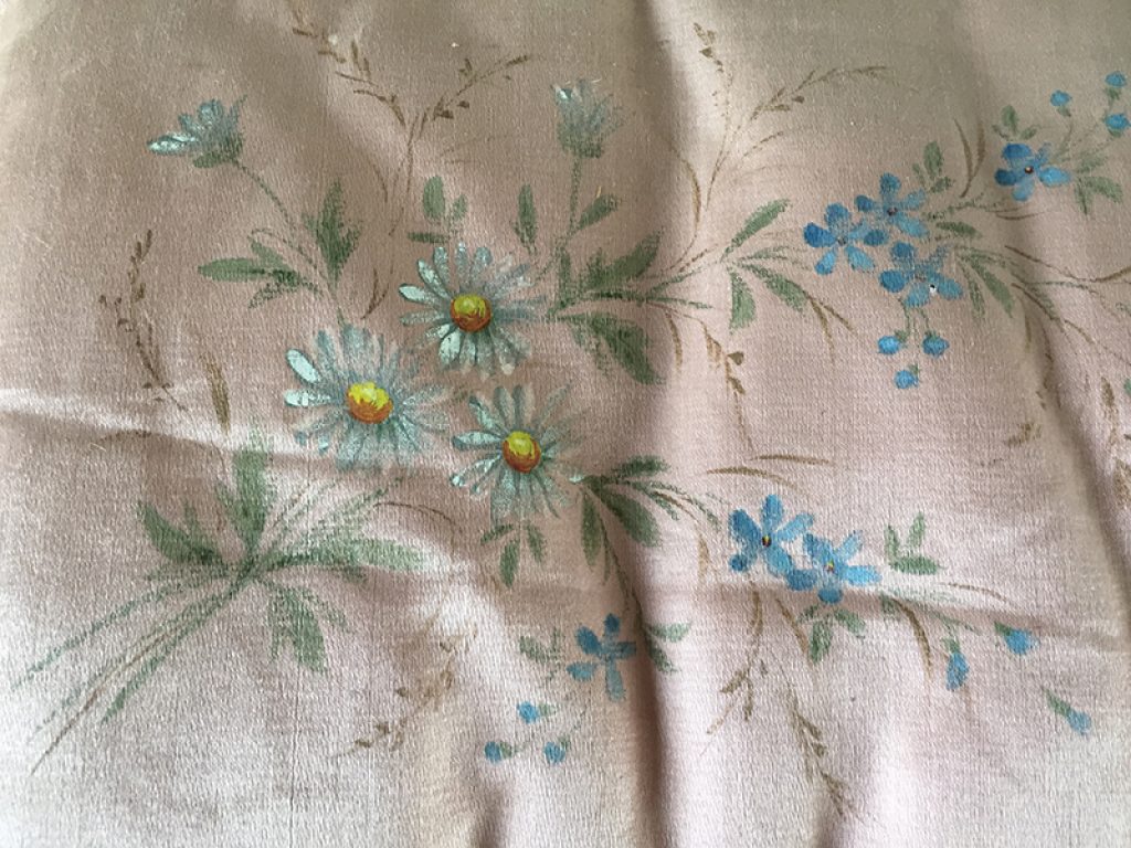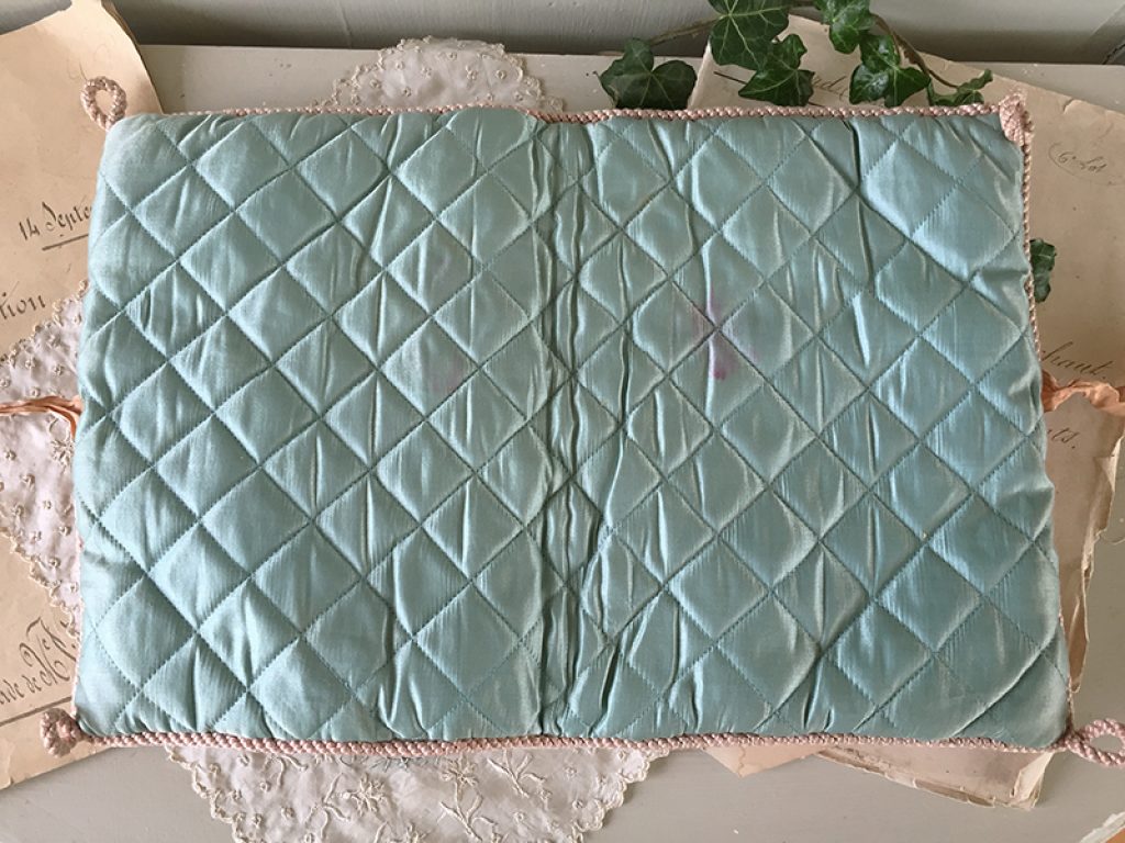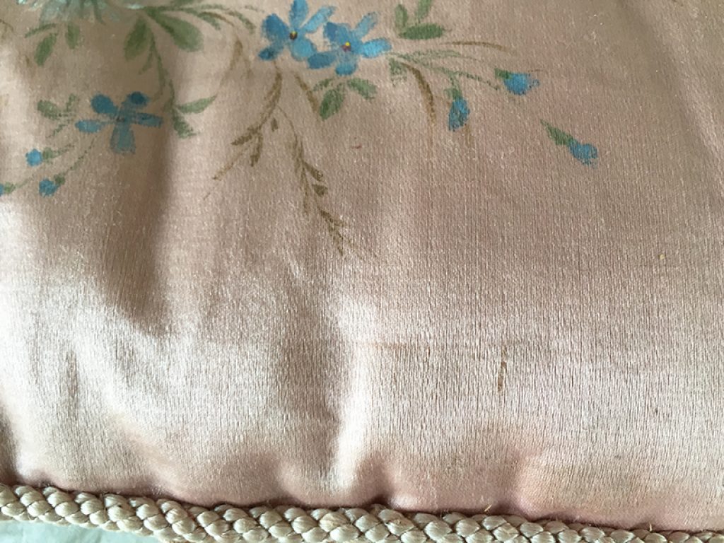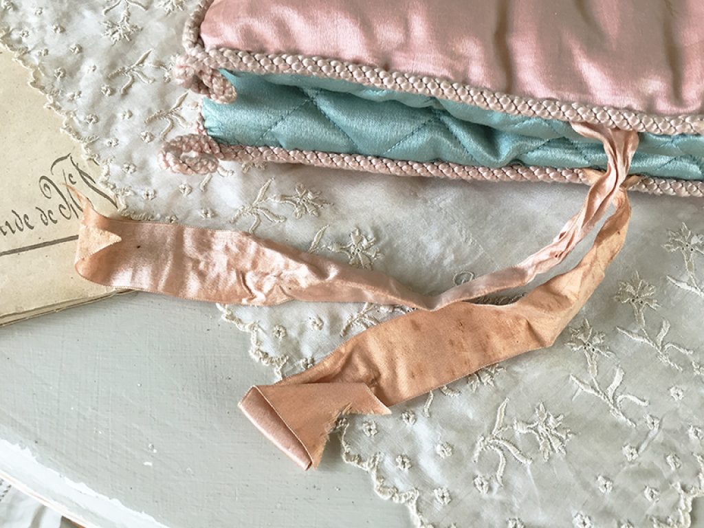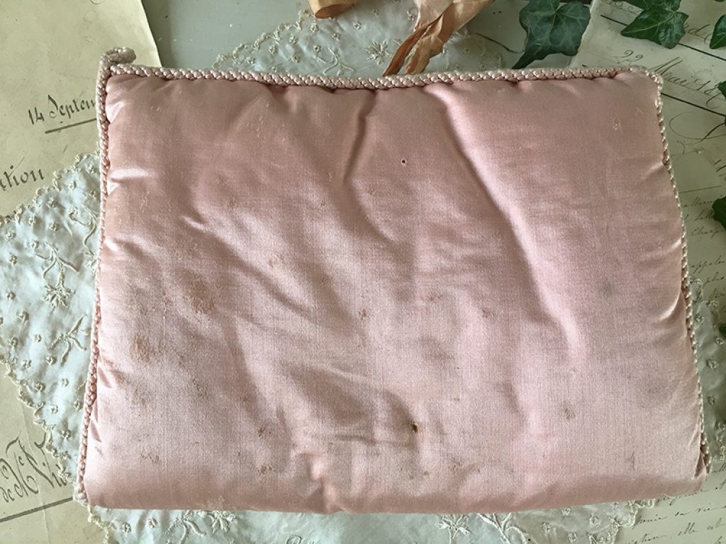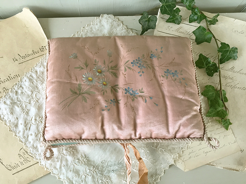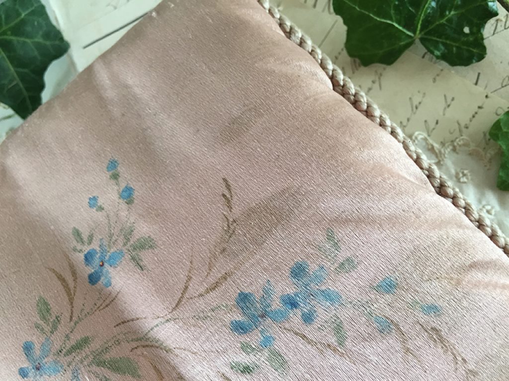 Elégante pochette ancienne pour lingerie ou mouchoirs, en soie peinte à la main d’un joli décor fleuri sur fond rose.