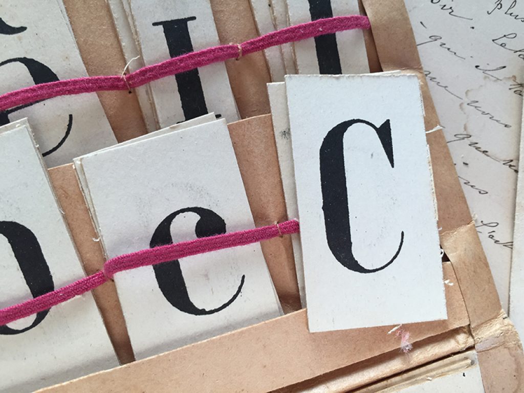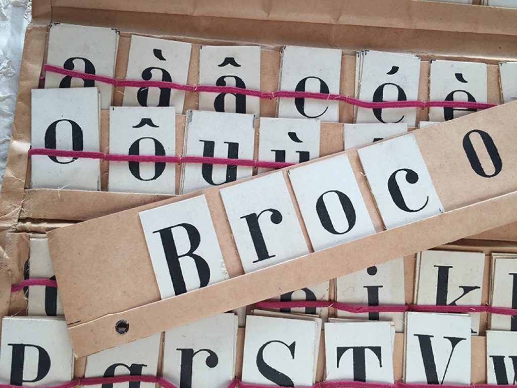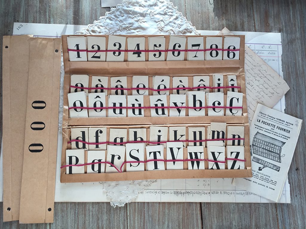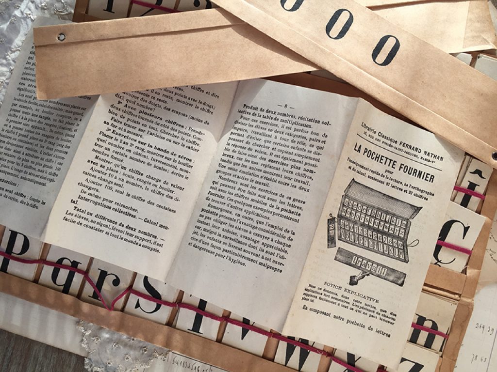Ancienne pochette en papier garnie de lettres et de chiffres sur petits cartons, pour l’apprentissage de la lecture, de l’orthographe et des chiffres. Une face pour les majuscules et l’autre face pour les minuscules. Pochette avec joli décor fleuri, édition Fernand Nathan. Elastiques intérieurs détendus. Toutes les lettres et tous les chiffres sont présents