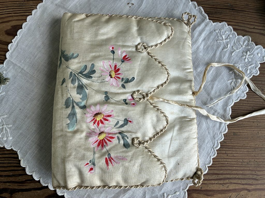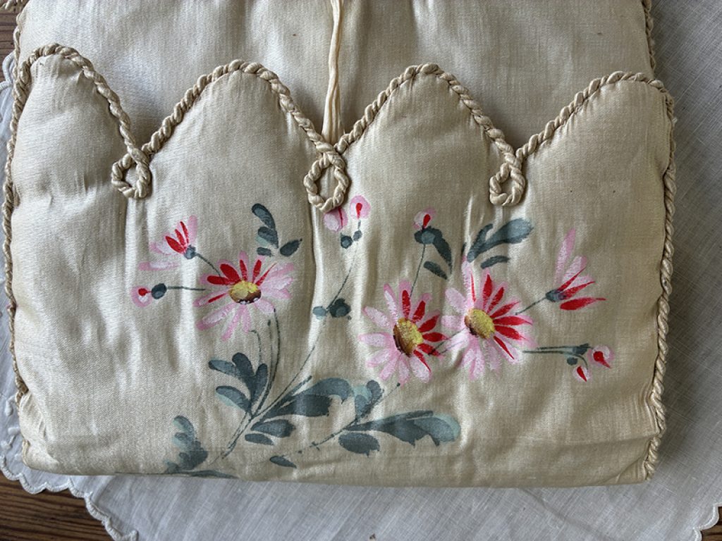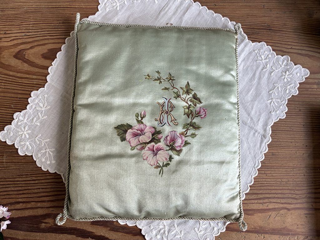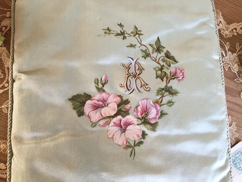 - A gauche : petit coussin en soie peint à la main d’un charmant décor de fleurs et monogramme. Mini trou sur l’envers . 22 x 26 cm : 40 euros