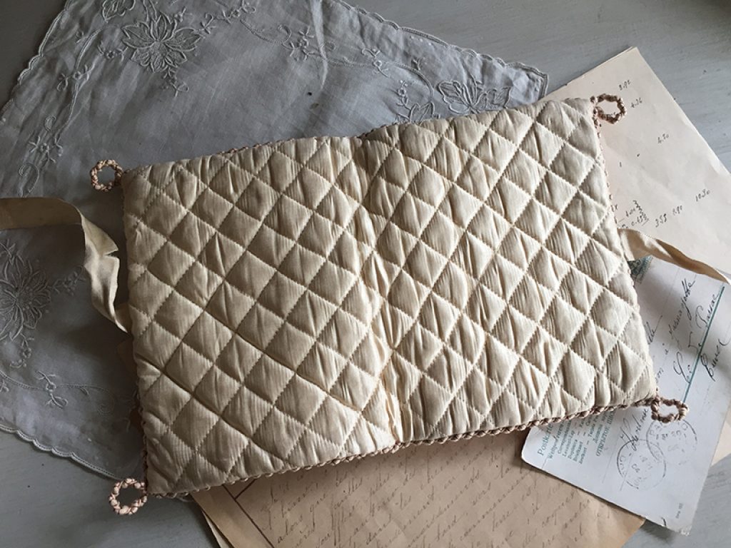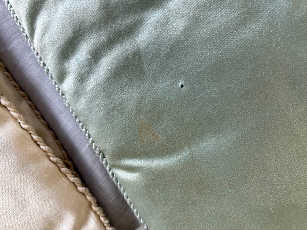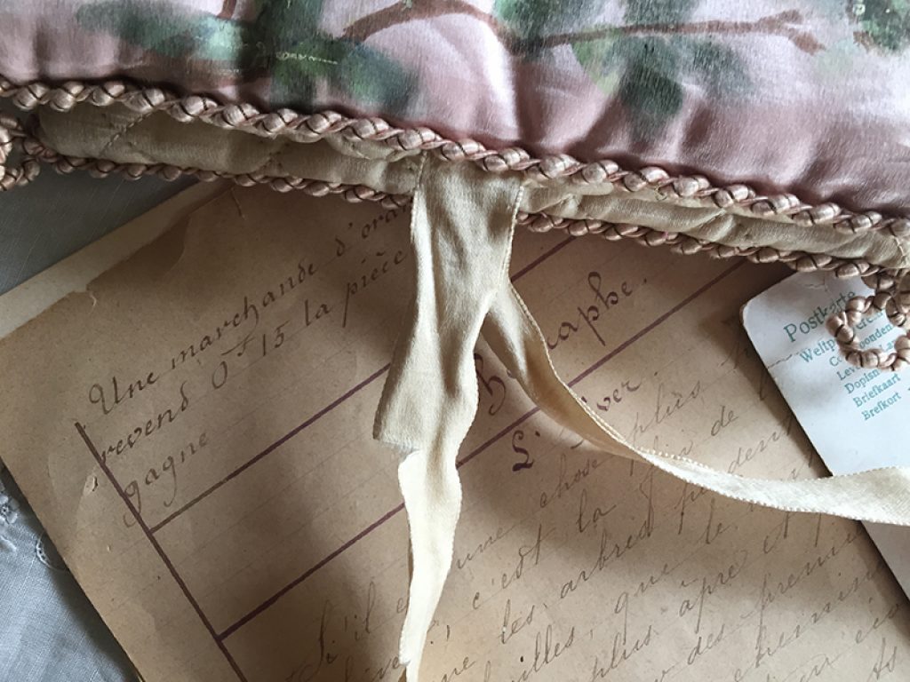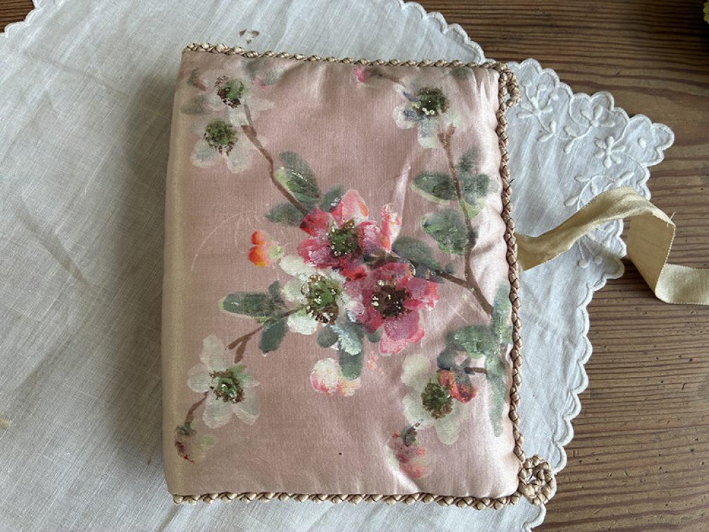 - A gauche : petit coussin en soie peint à la main d’un charmant décor de fleurs et monogramme. Mini trou sur l’envers . 22 x 26 cm : 40 euros
