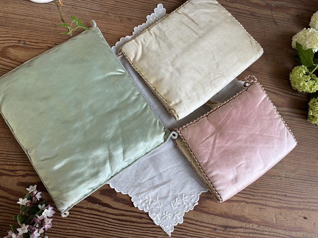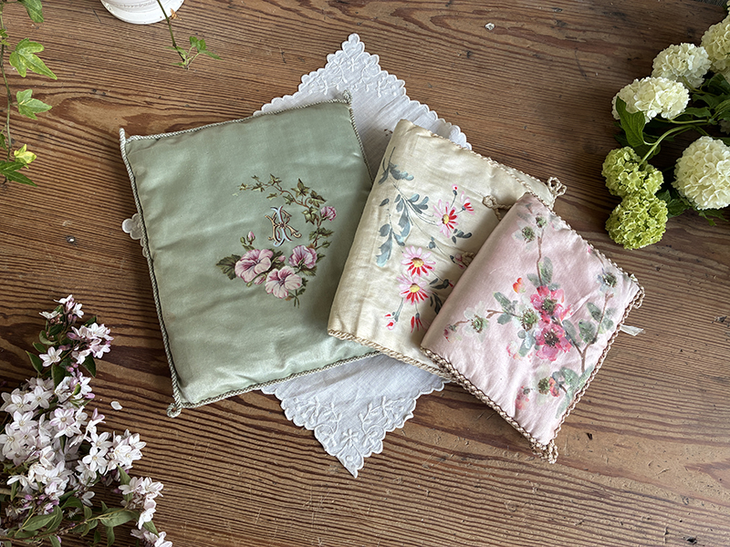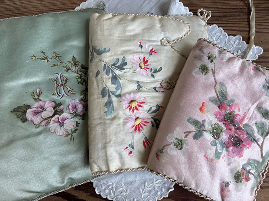 Deux anciennes pochettes à mouchoirs ou lingerie et un coussin, en soie peints à la main. Vendus séparément.