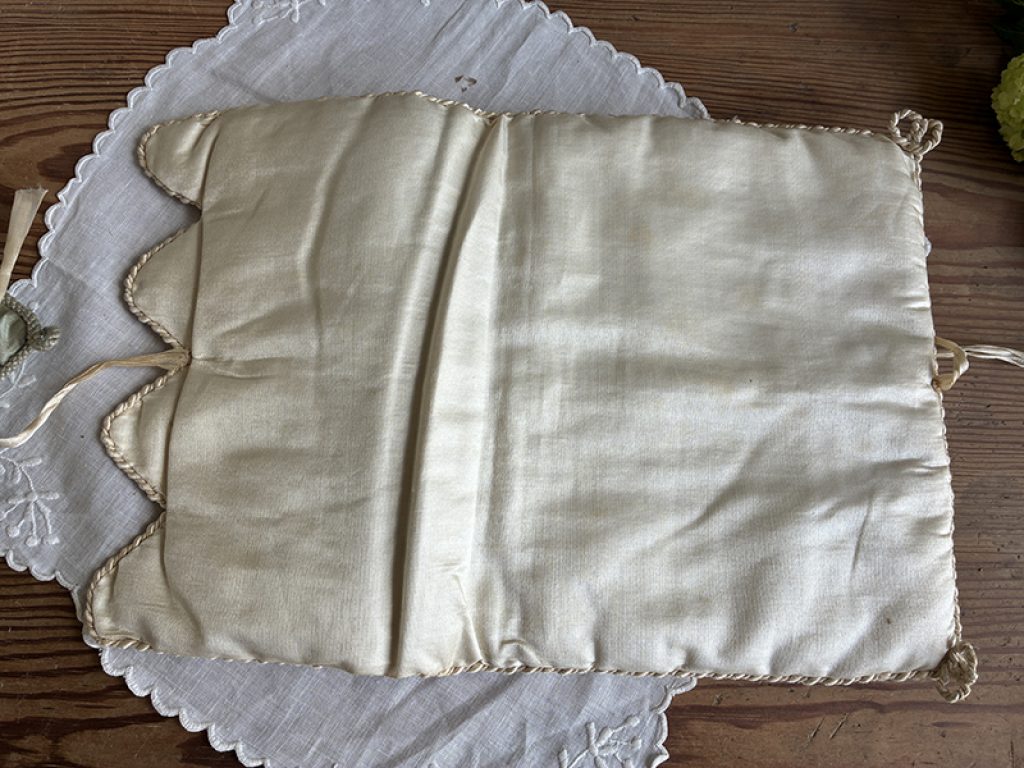 - Au centre : pochette fond crème, usure sur les cordons : 18 x 22 cm. 30 euros RESERVEE