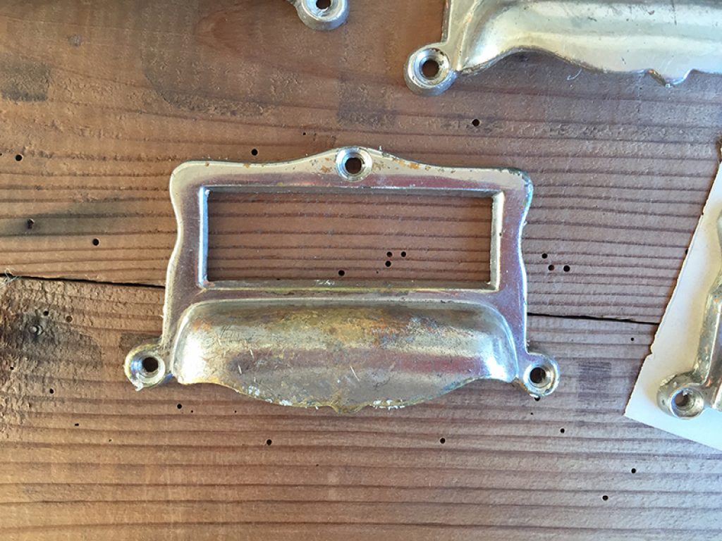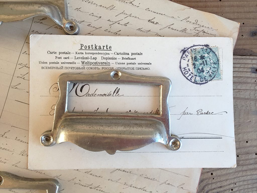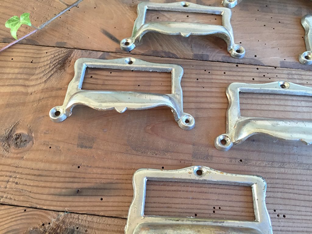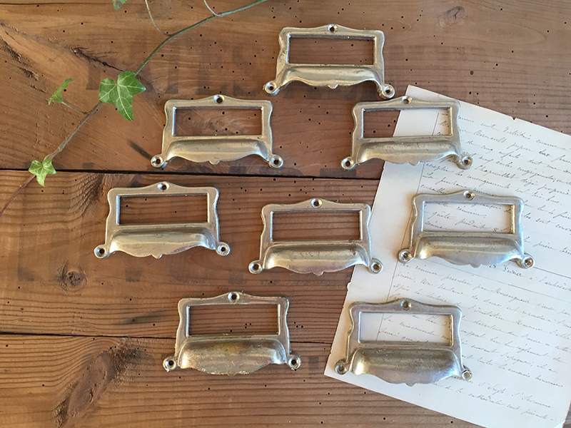 Huit anciennes poignées porte étiquettes en métal chromé, parfaites pour tiroirs de meuble de métier. Vendues séparément. Légères traces d’usage