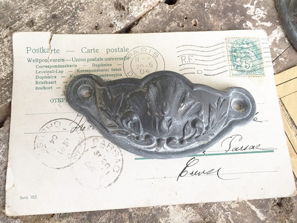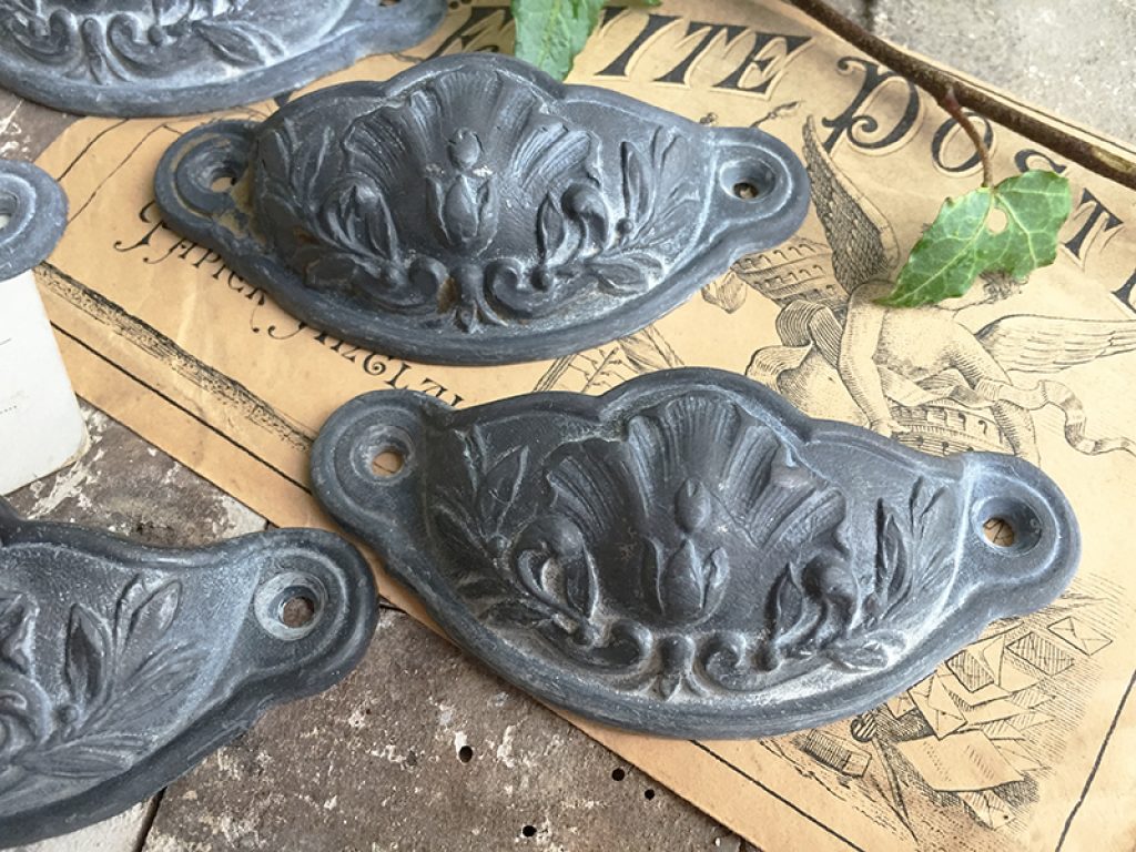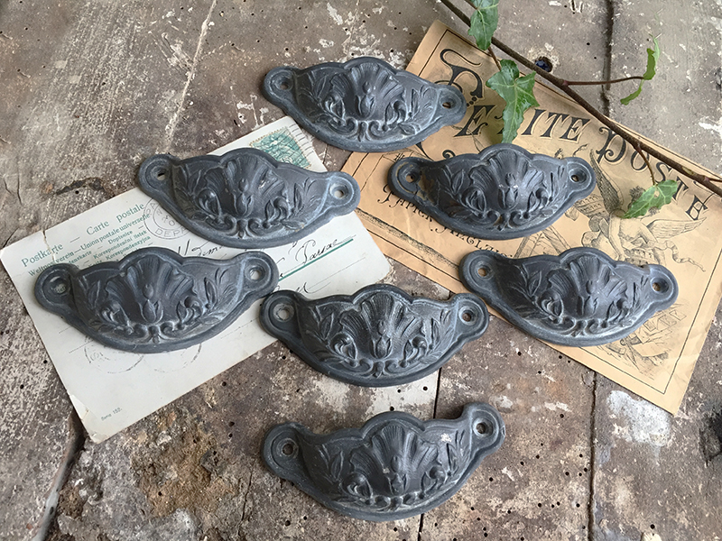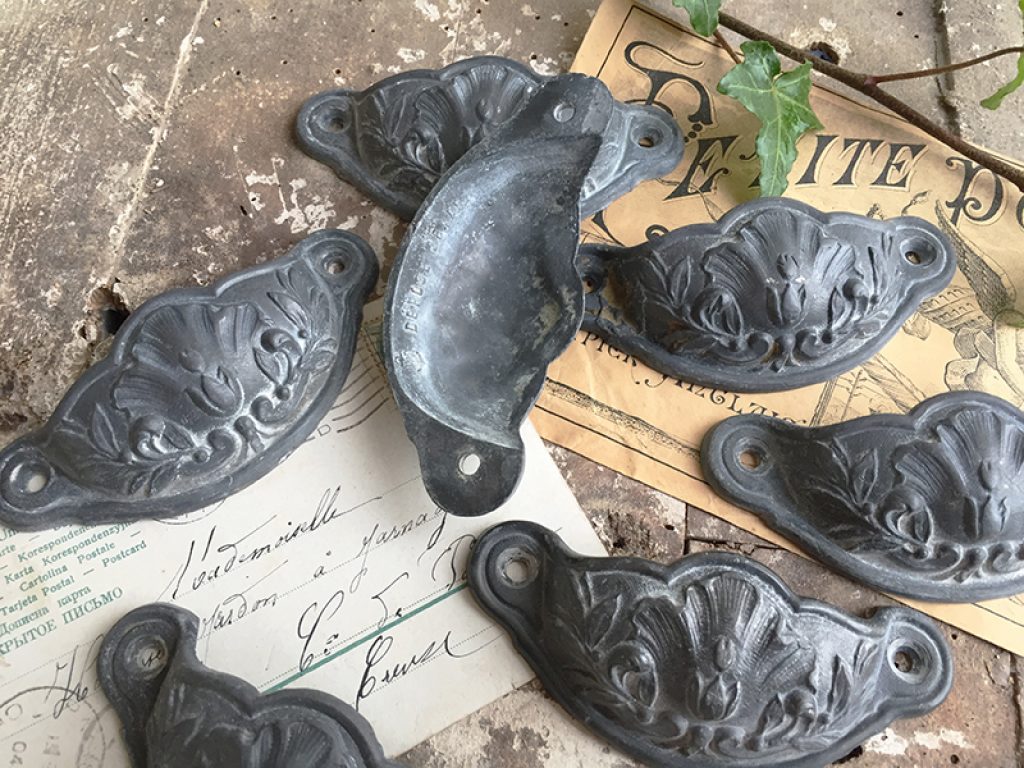Sept anciennes poignées coquille en métal, vendues à l’unité. Parfaites pour un meuble de métier.