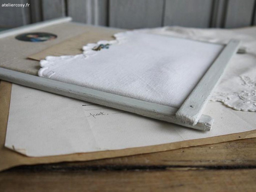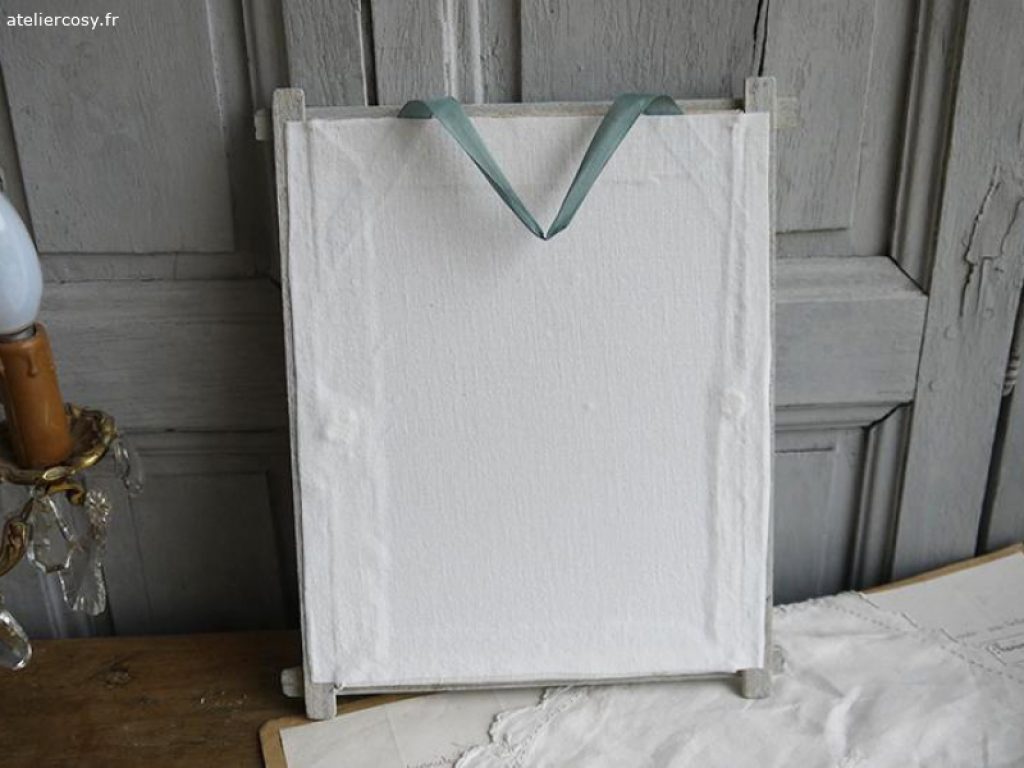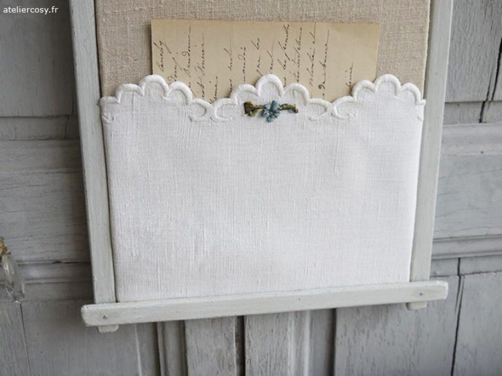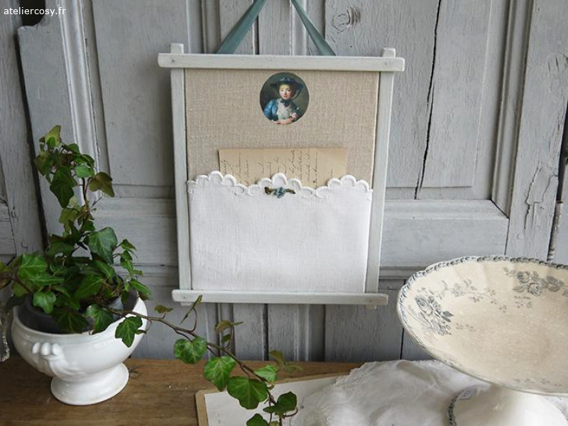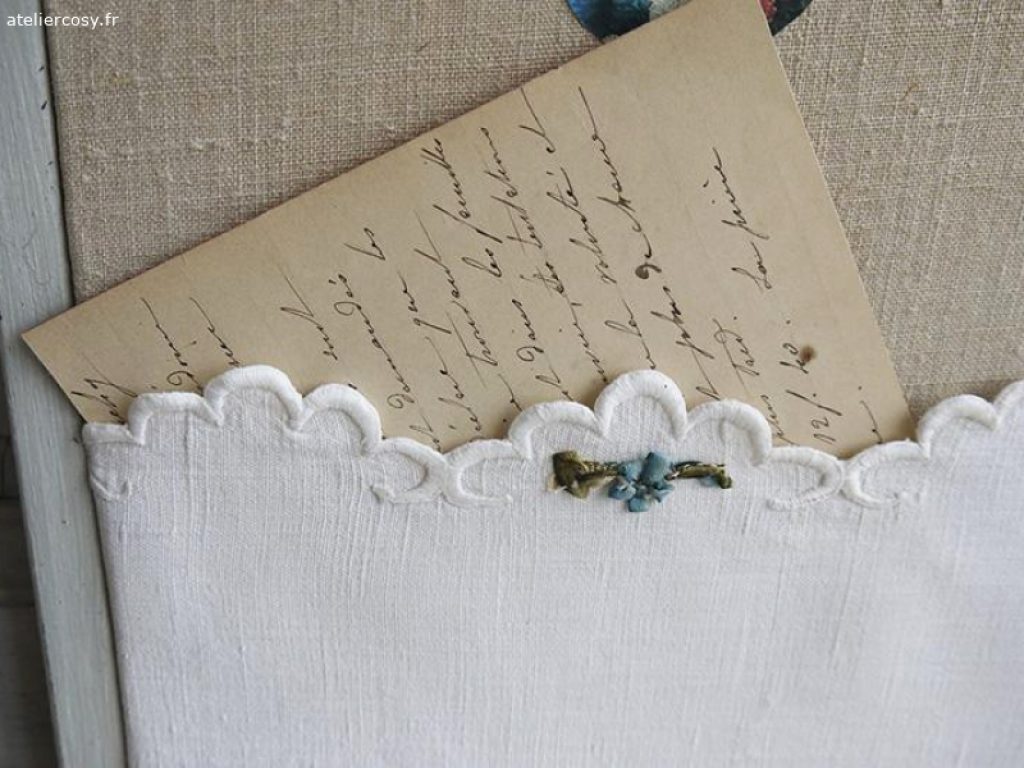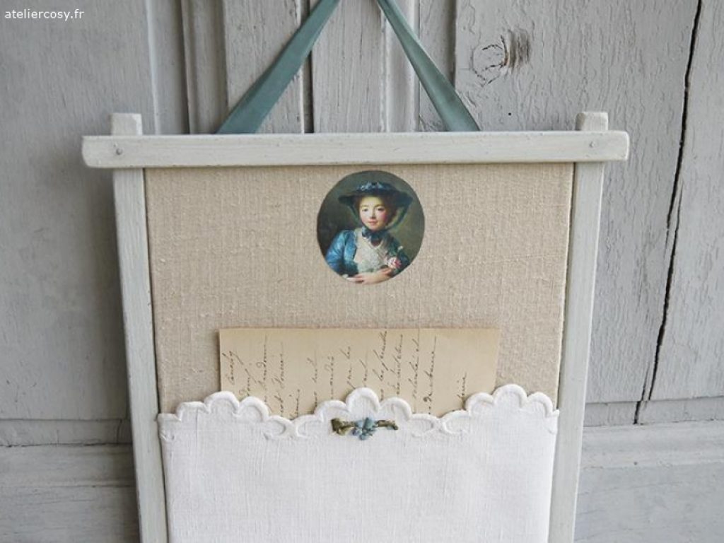 Cadre vide poche ou range courrier réalisé avec des matériaux anciens et une reproduction d’image sur papier. Une poche en drap brodé garnie d’une feuille manuscrite permet d’y glisser des mots doux ou du courrier, selon les envies !
