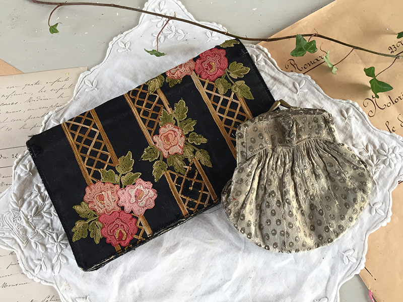 • Noir avec jolie broderie, traces d’usure. 20 x 12 cm .