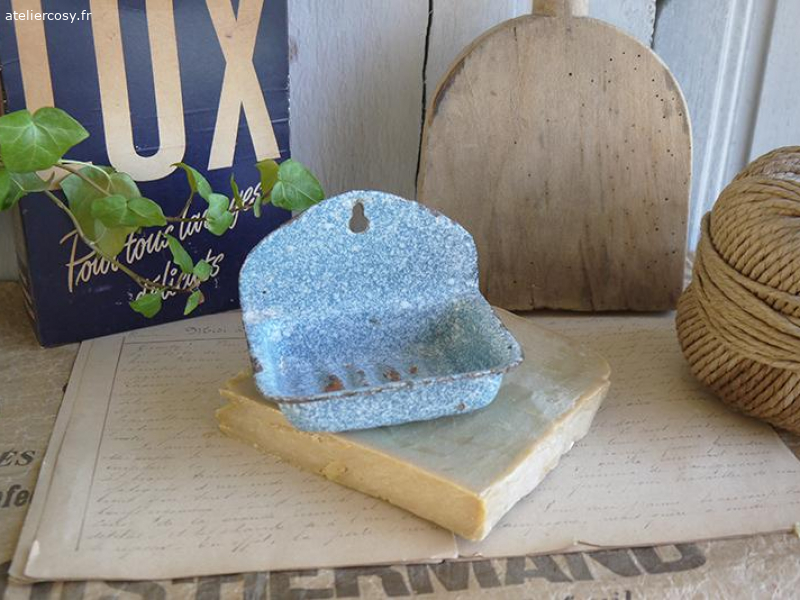 Ancien porte savon émaillé bleu, comportant quelques manques dus à son âge. 12 x 9 cm, hauteur 9 cm