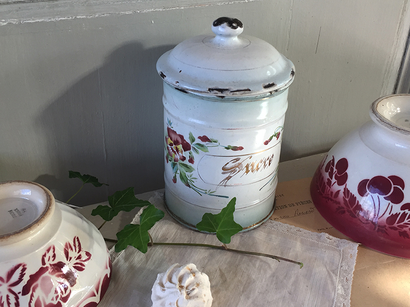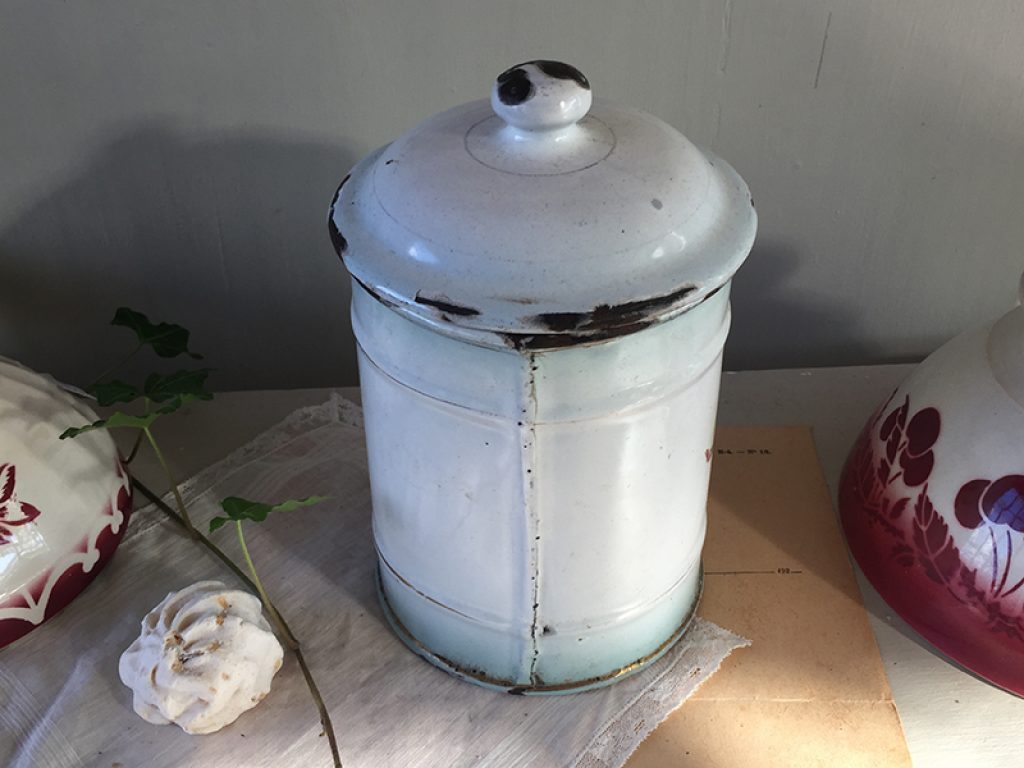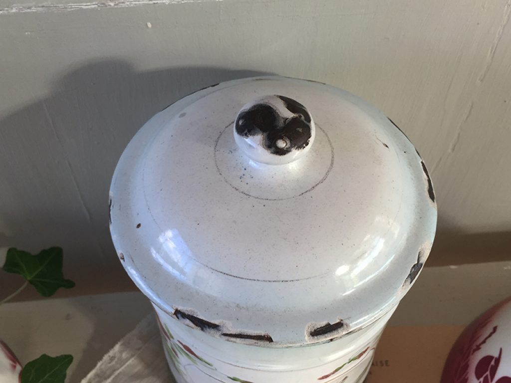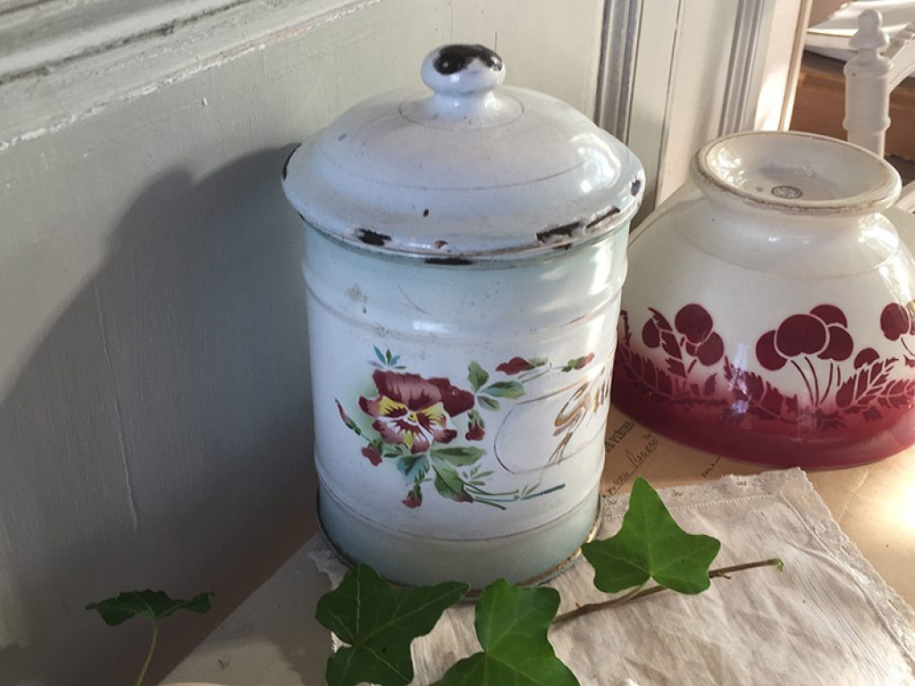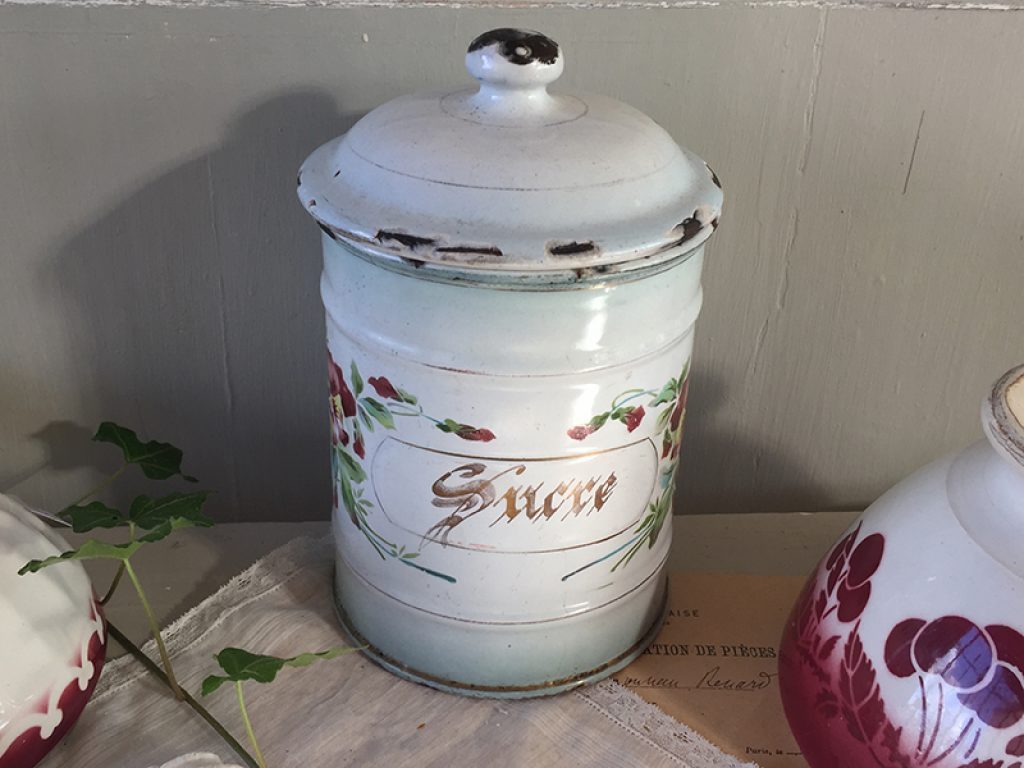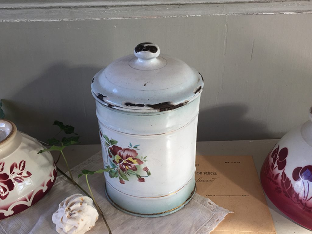 Ancien pot en tôle émaillée pour le sucre, avec joli décor de pensées. Quelques manques dus à son âge.