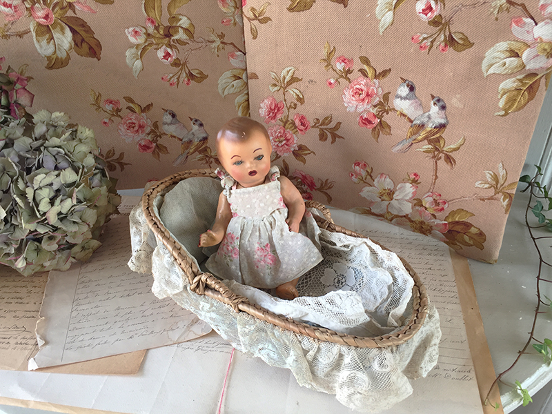 Adorable petite poupée ancienne en carton bouilli, vêtue d’une jolie robe en tissu fleuri et son couffin bordé de dentelle avec oreiller et couvre lit.