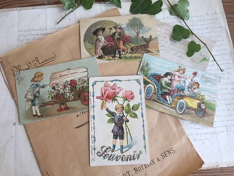 Lot de quatre anciennes cartes postales avec jolis décors enfantins.