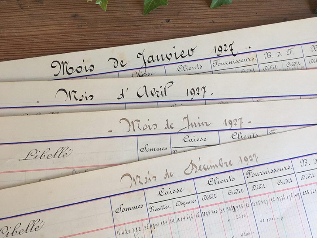 Lot de quatre anciennes feuilles avec belle écriture à la plume, à utiliser en napperon charmant ou pour travaux de création.