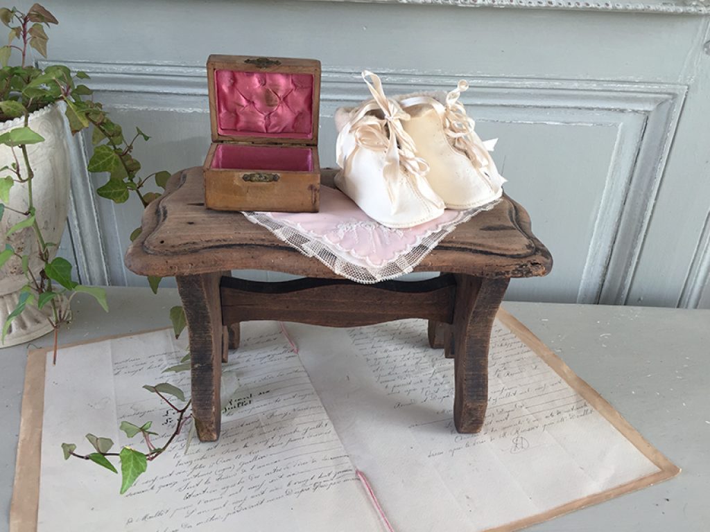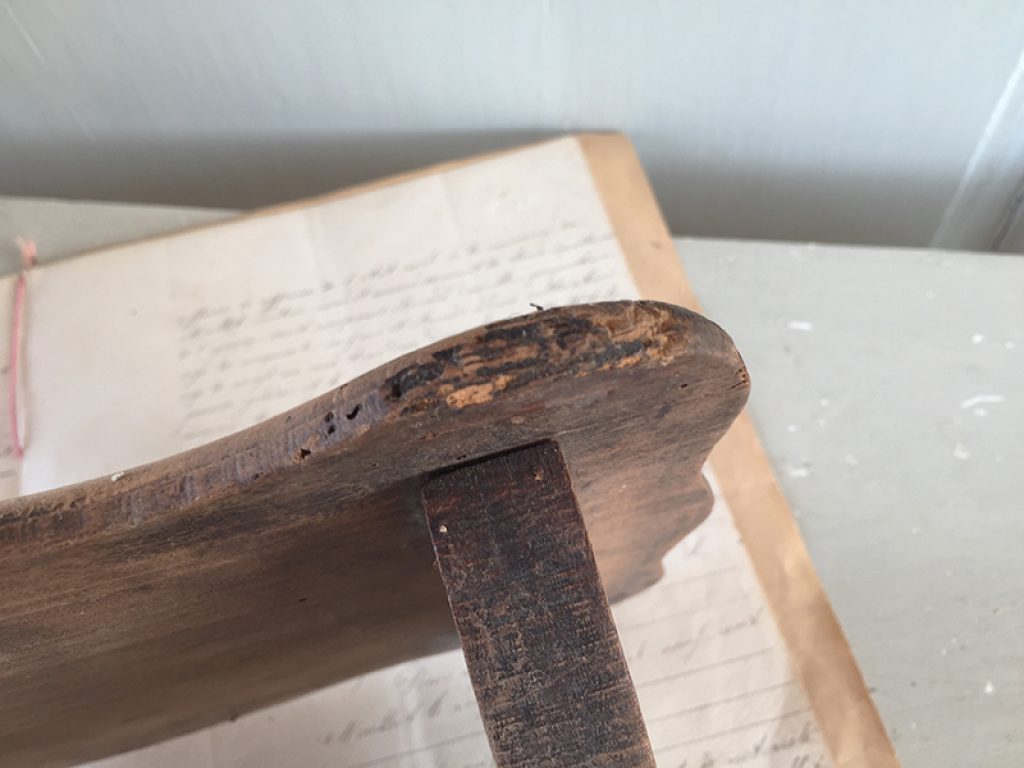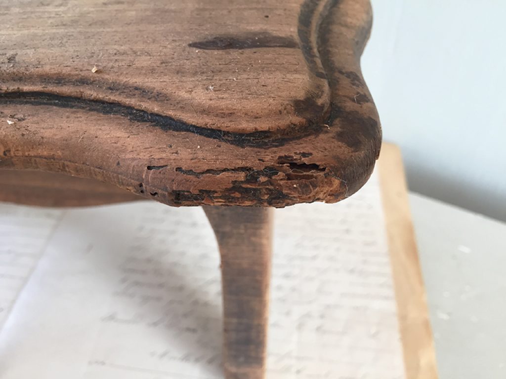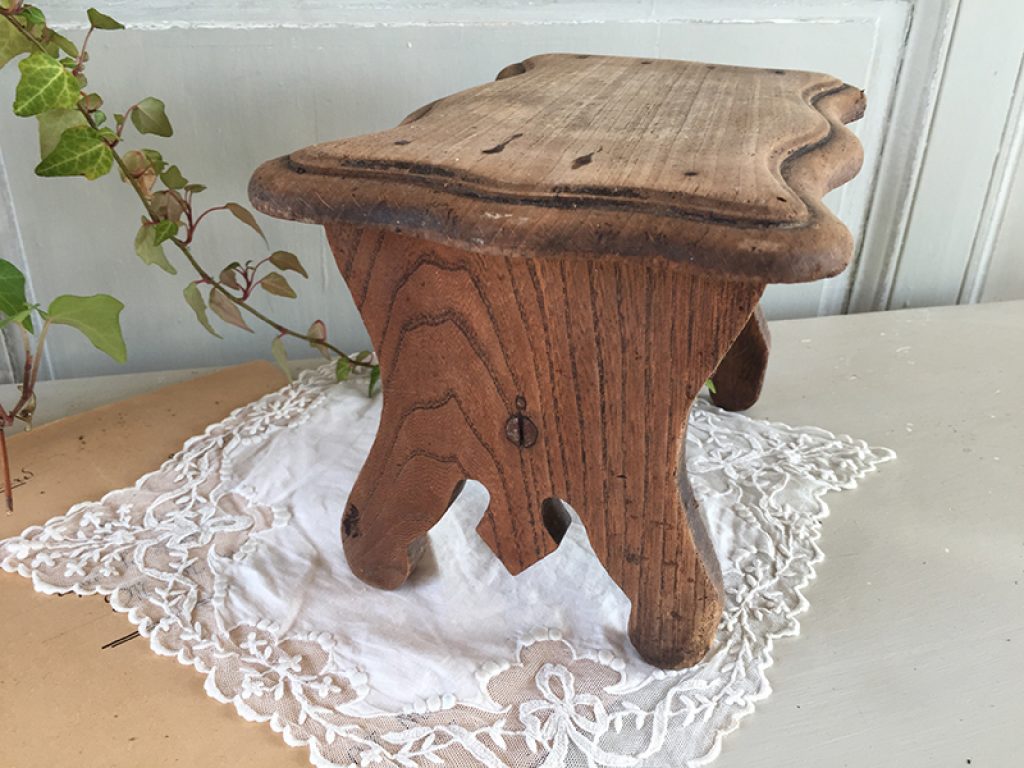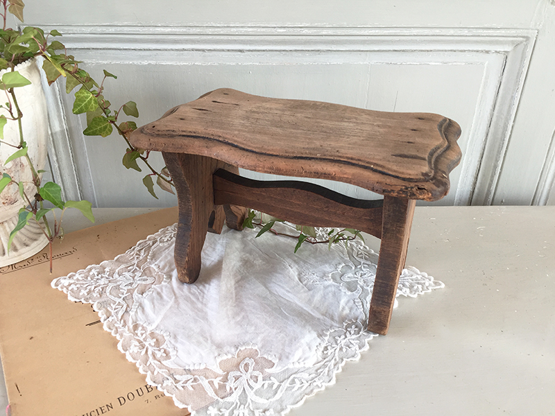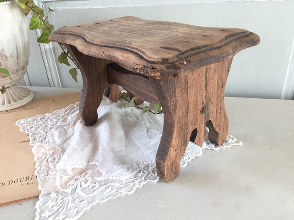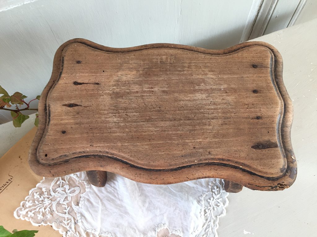 Ancien repose pied en bois laissé couleur naturelle, pouvant également servir de socle pour présenter des objets (non fournis). Traces de piqûres traitées, en particulier sur un angle.