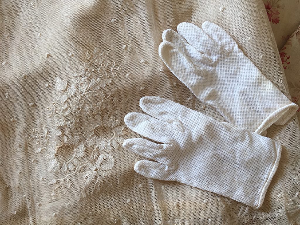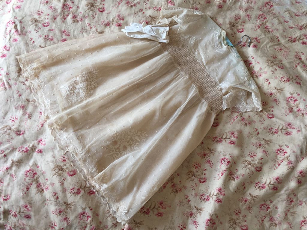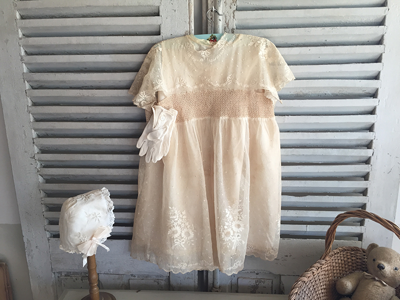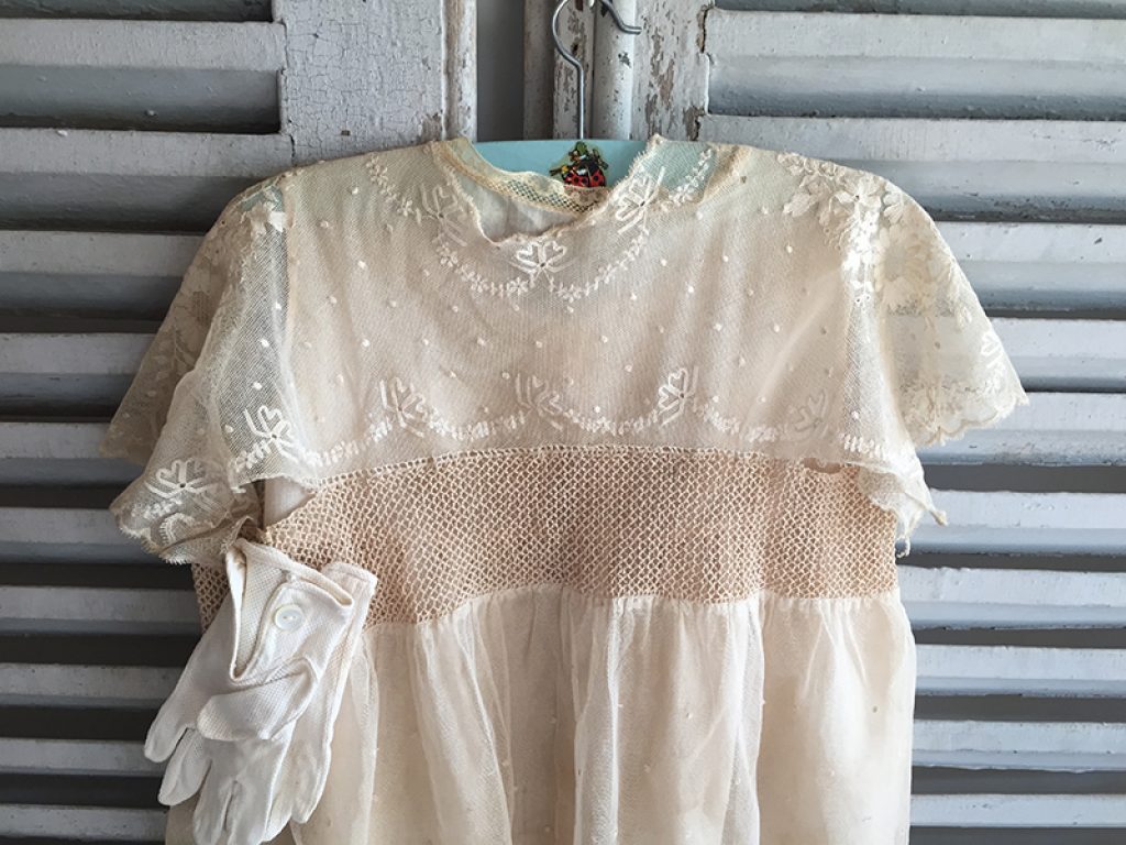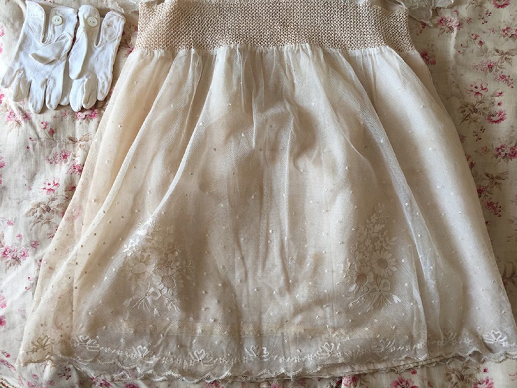 Adorable petite robe ancienne en dentelle, avec sous robe et paire de gants. Petits trous, auréoles de stockage (non lavée)