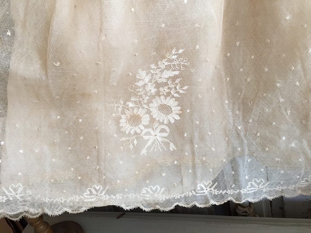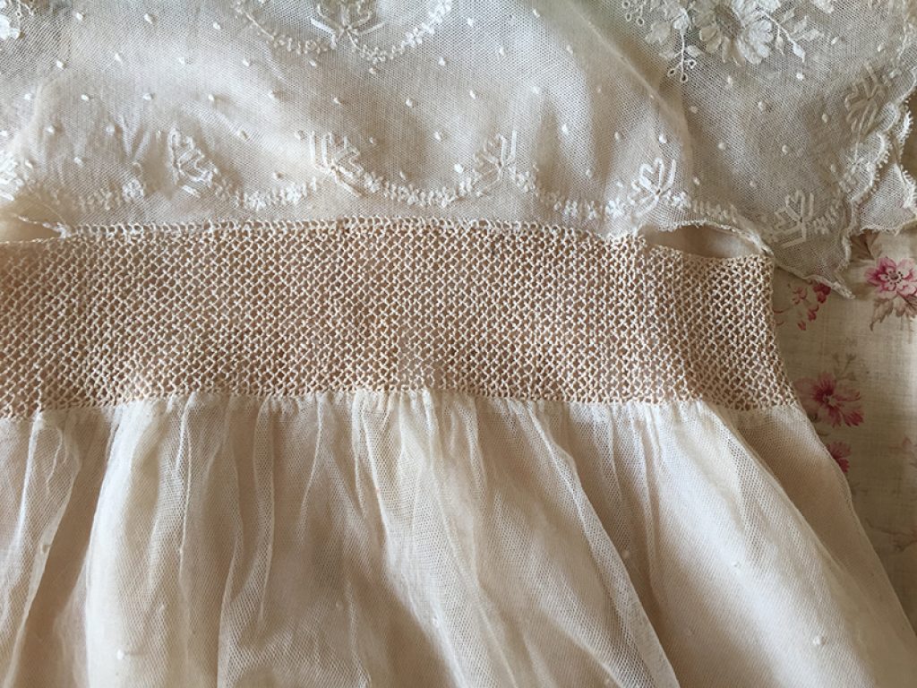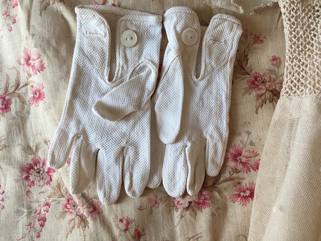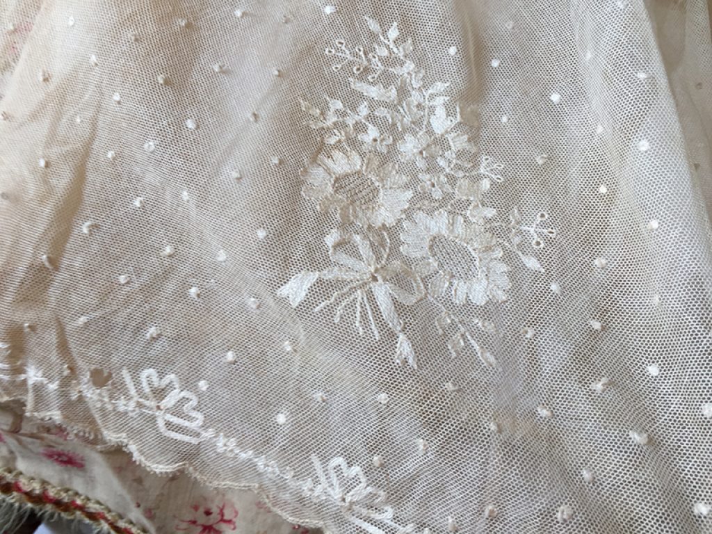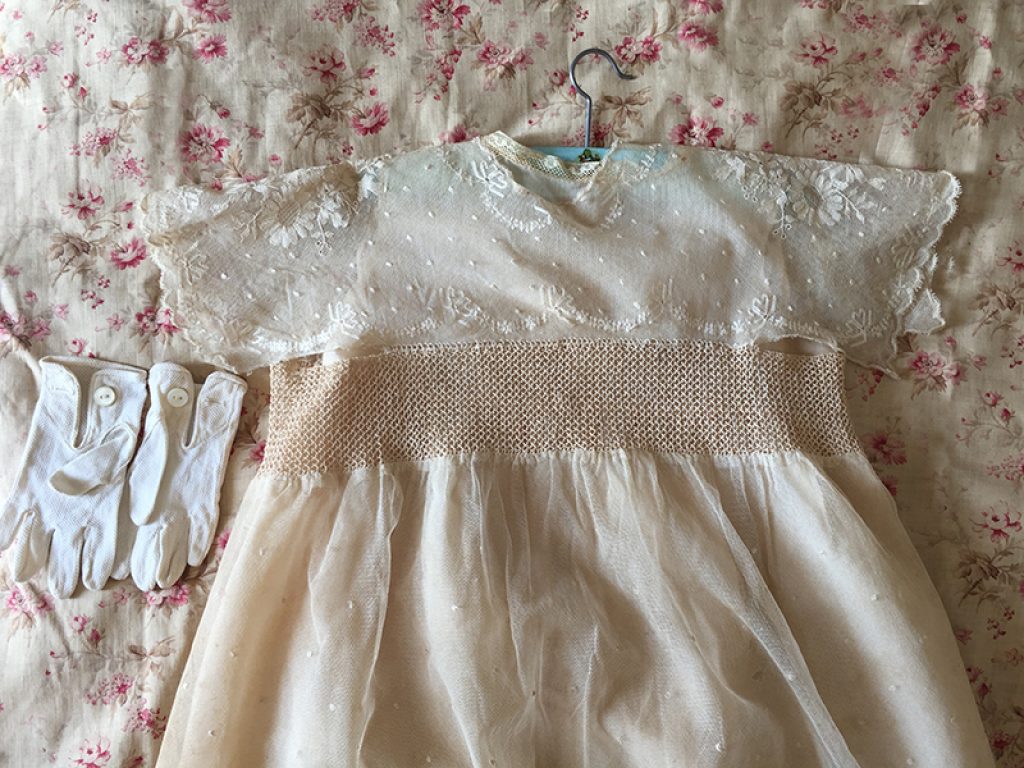 Adorable petite robe ancienne en dentelle, avec sous robe et paire de gants. Petits trous, auréoles de stockage (non lavée)