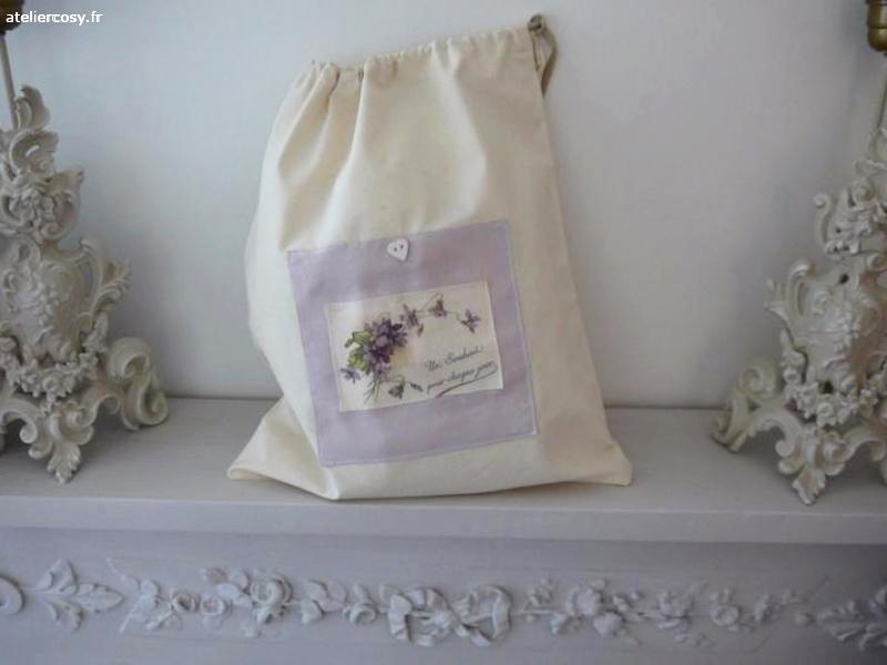 Un petit bouquet de violettes pour fleurir la maison ! en transfert d’image sur petit sac pochette, inscription » Un souhait pour chaque jour » , fermeture par lien coulissant. 30 x 36 cm