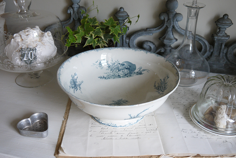 Ancien saladier en faïence de Lunéville, au joli décor bleu, modèle » Champêtre « . Bon état général