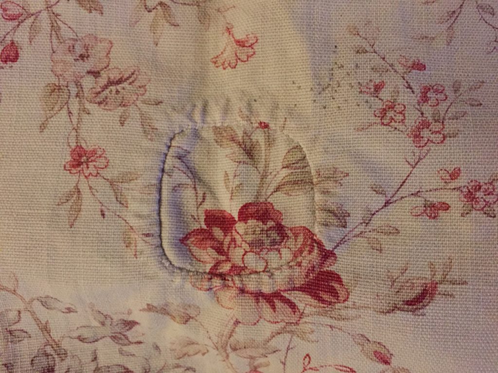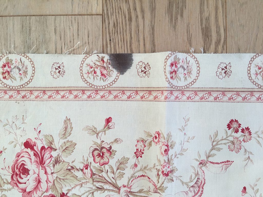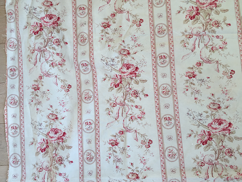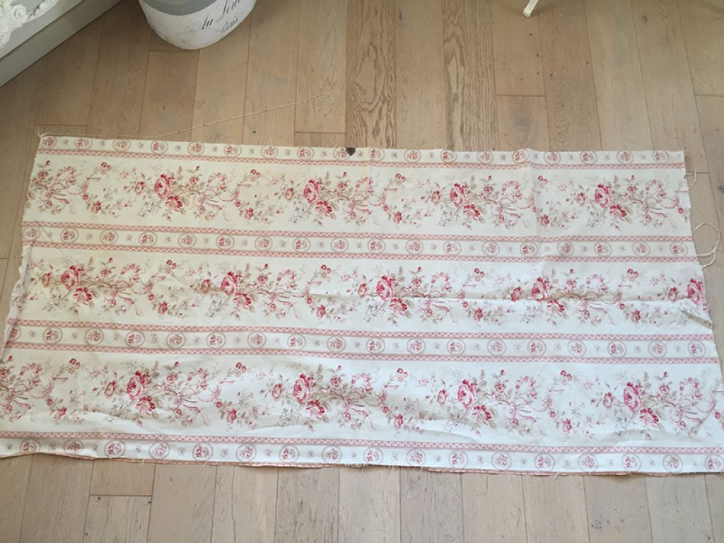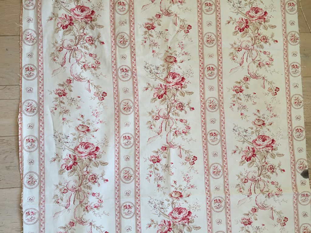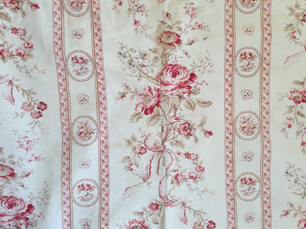 Ravissant coupon de tissu ancien au très charmant décor de roses. Le tissu est légèrement fané par le temps. Petite taches noire sur le bord et autres petites plus discrètes. Couture ( 23 cm de haut) au centre, une pièce. 85 x 180 cm