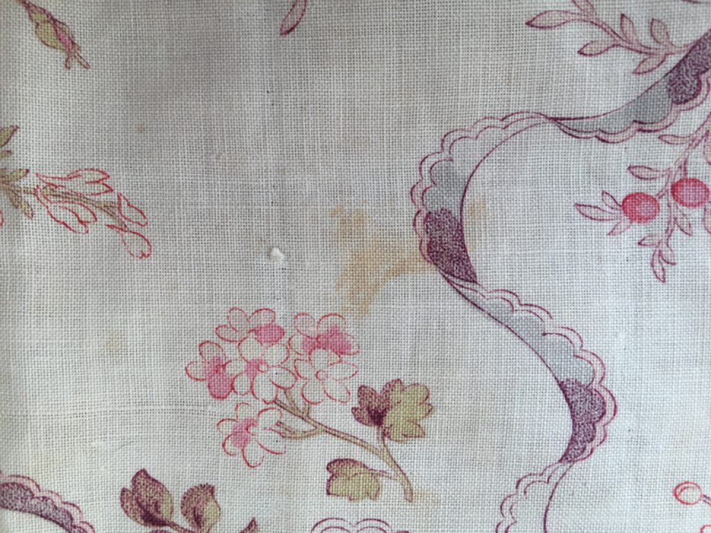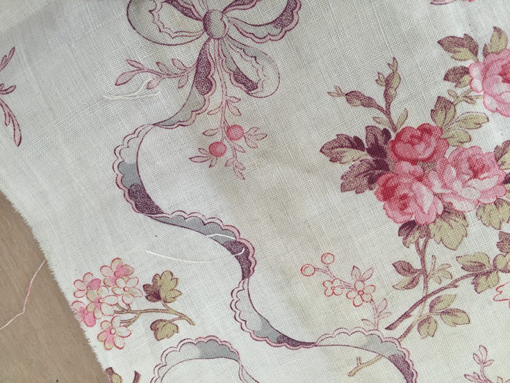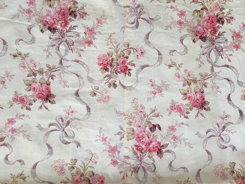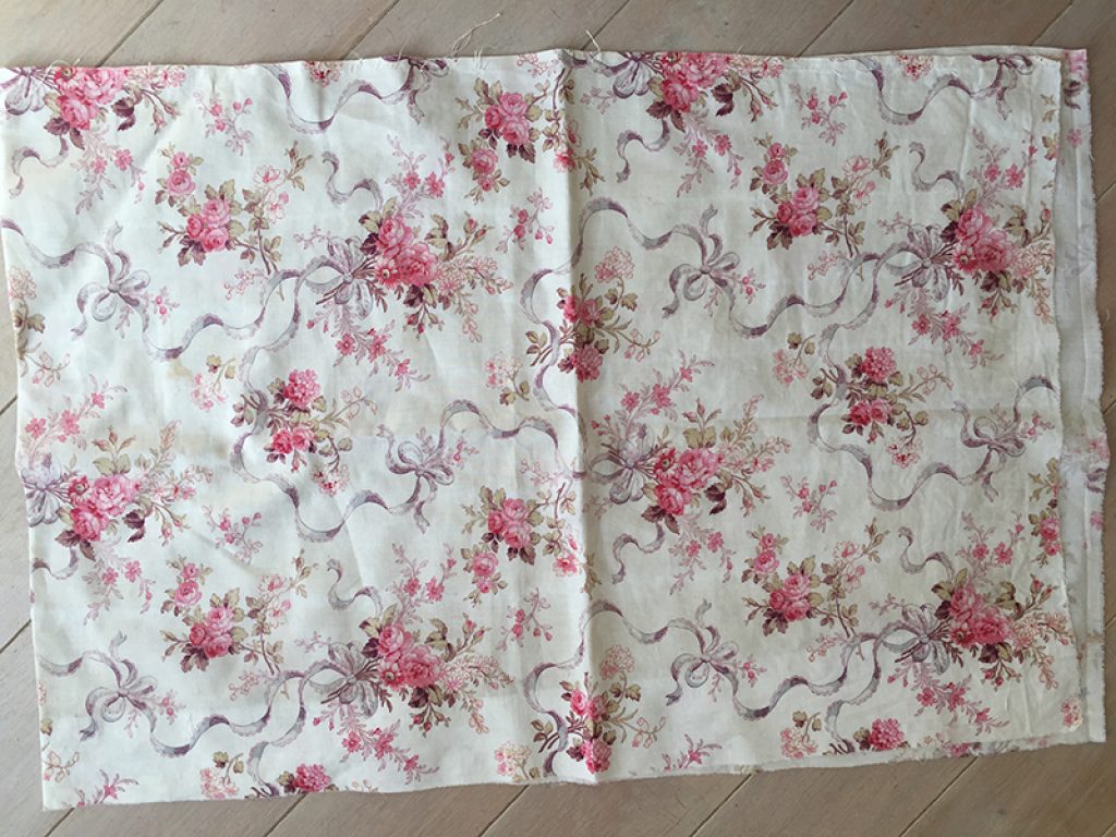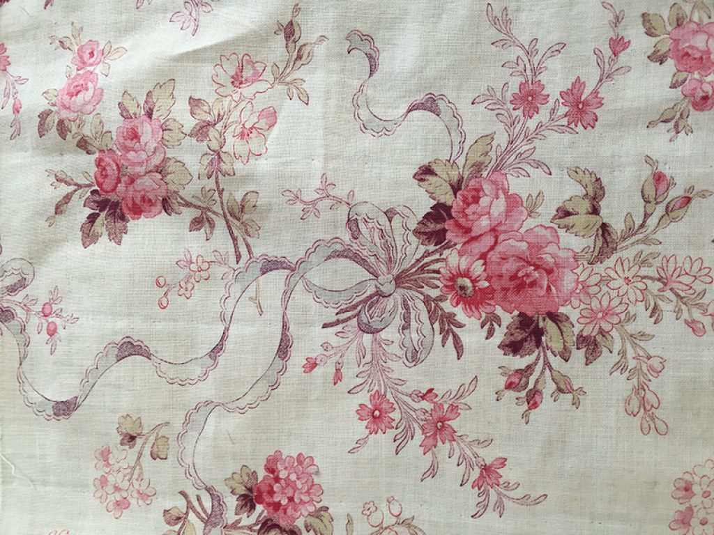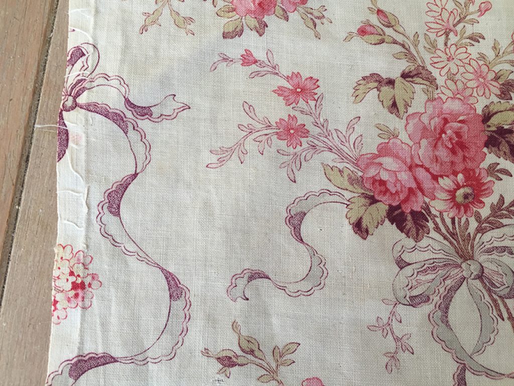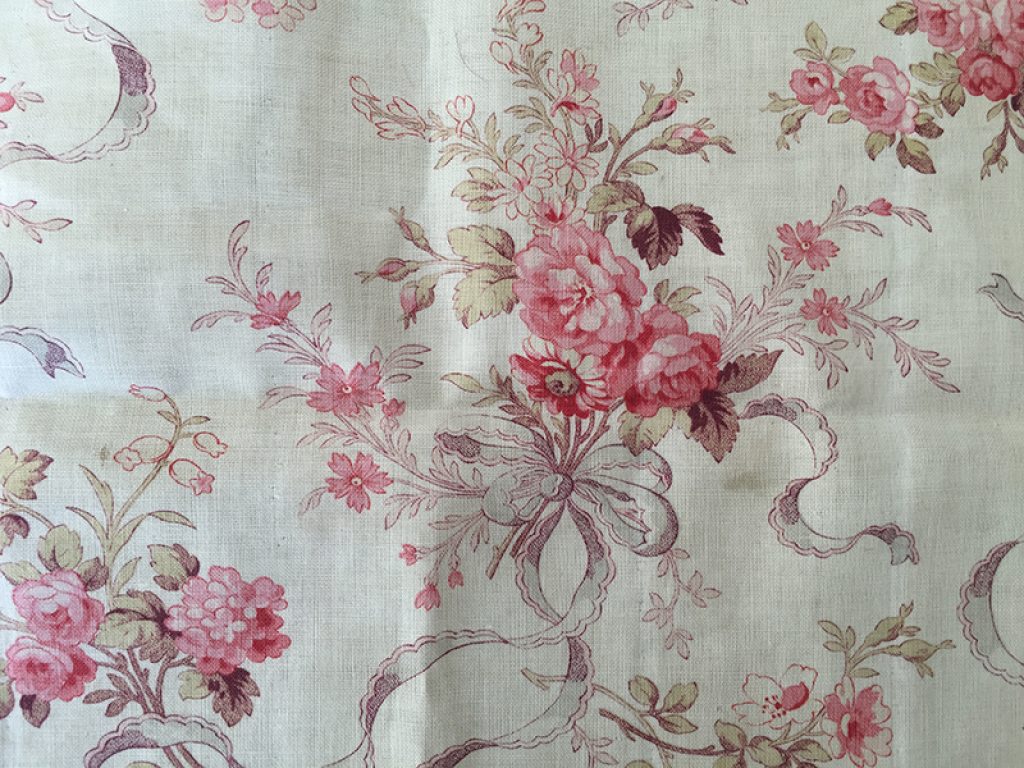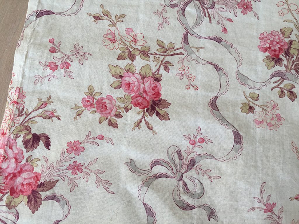 Ravissant coupon de tissu ancien en coton fin, décousu d’un boutis. Fond blanc crème, traces d’ourlet sur les bords, petites taches de rouille et anciennes marques de pliures. Joli décor de fleurs et rubans. 50 x 147 cm